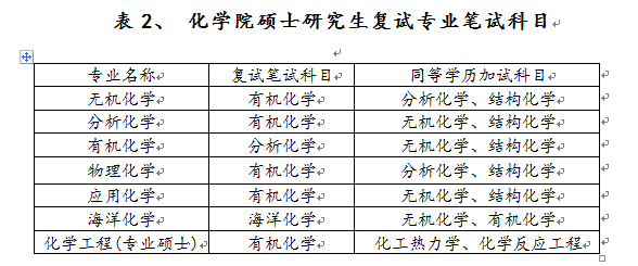 化学院各专业笔试科目见表2。考试时间为两小时,满分为100分。