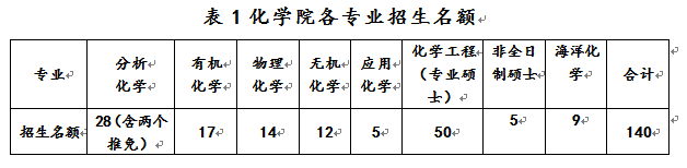 2019年,化学院招收调剂的专业包括:物理化学(学硕)、无机化学(学硕)、应用化学(学硕)、海洋化学(学硕)和化学工程(专硕,含全日制和非全日制)。第一志愿报考化学、化学工程专业及相近专业,且符合调剂要求的考生可申请向我院调剂。