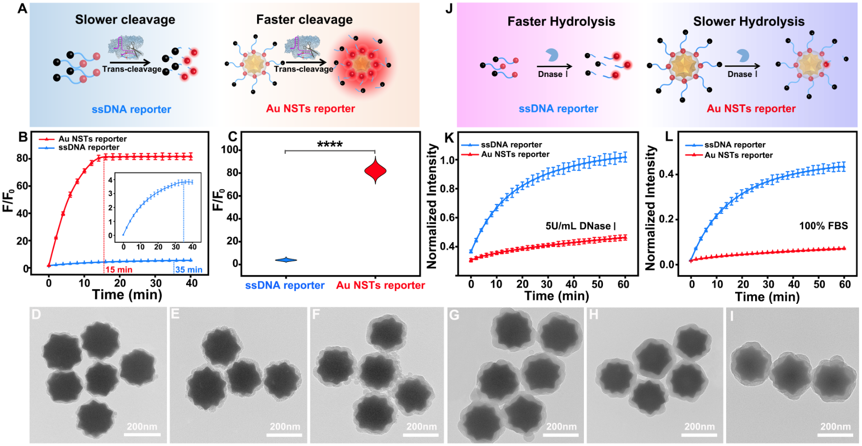 考虑到荧光染料的光漂白导致的灵敏度不足问题以及CRISPR-Cas 12a与传统ssDNA报告子之间随机碰撞导致的切割反应动力学速率低,稳定性差等问题,我们制备了具有20个对称“热点”的金纳米星(Au NST)并选择其作为空间限制效应和PEF基底,制备了Au NST报告子(图2)。与传统ssDNA报告子相比,Au NST报告子具有更快的反应动力学,反应时间从35min缩短至15min,荧光强度提高了近21.5倍。此外,由于球形核酸设计,Au NST报告子对核酸酶(如DNase I)以及FBS的抗降解能力也得到了提升(图3)。