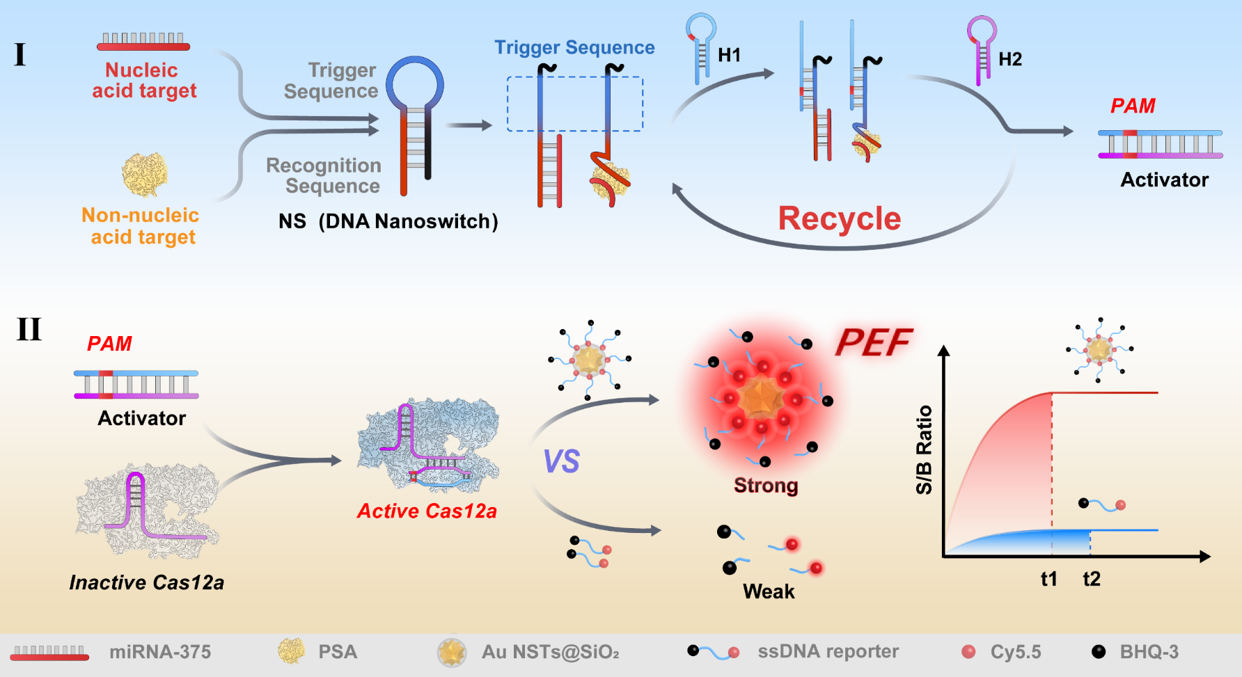 针对上述科学问题,化学院罗细亮/徐升豪课题组基于前期等离子体激元共振增强荧光(PEF)的高灵敏精准分子检测的工作基础上(Chem. Sci. 2024, 15, 566-572; Anal. Chem. 2024, 96, 16971–16977; Anal. Chem. 2024, 96, 4402-4409; Anal. Chem. 2023, 95, 3525-3531; Anal. Chem. 2022, 94, 5399-5405; Anal. Chem. 2022, 94, 16887-16893; Anal. Chem. 2022, 94, 14467-14474; Anal. Chem. 2021, 93, 2480-2489),开发了一种基于可编程DNA纳米开关(NS)调控的等离子体CRISPR-Cas12a金纳米星(Au-NST)报告平台,并且在空间限制效应的辅助下实现了核酸和非核酸生物标志物的检测(图1)。通过改变NS的识别区域序列,核酸(miRNA-375)和非核酸目标物(PSA)均能打开NS使其暴露出相同的CHA触发序列,经过CHA反应后释放出相同的激活器(双链DNA)并激活Cas12a,实验表明该设计仅需要改变NS的识别区域序列,便可利用一种crRNA实现两种不同类型目标物的检测(图1)。