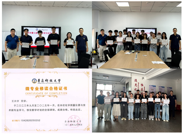 9月9日下午,“化学测量仪器与技术”微专业2023级和2025春季班两期学生的结业仪式在第一实验楼101会议室举行。微专业负责人李东祥老师简单回顾了这两期微专业学生的教学情况,称赞了同学们在微专业学习中的努力坚持和所取得的成绩。郭维斯副院长向同学们表示祝贺,为同学们颁发了微专业修读合格证书,强调了在教育部“双千”计划中微专业对提高学生知识结构的复合性、提升与社会需求的匹配度的重要作用,希望同学们能够将所学知识应用于实践。同学们表示很珍惜这次学习经历,获得了许多新知识,将在未来学习和工作中应用所学知识,提高就业能力。应用化学专业教研室贾肖飞老师、学科实验中心陈磊老师出席了仪式。