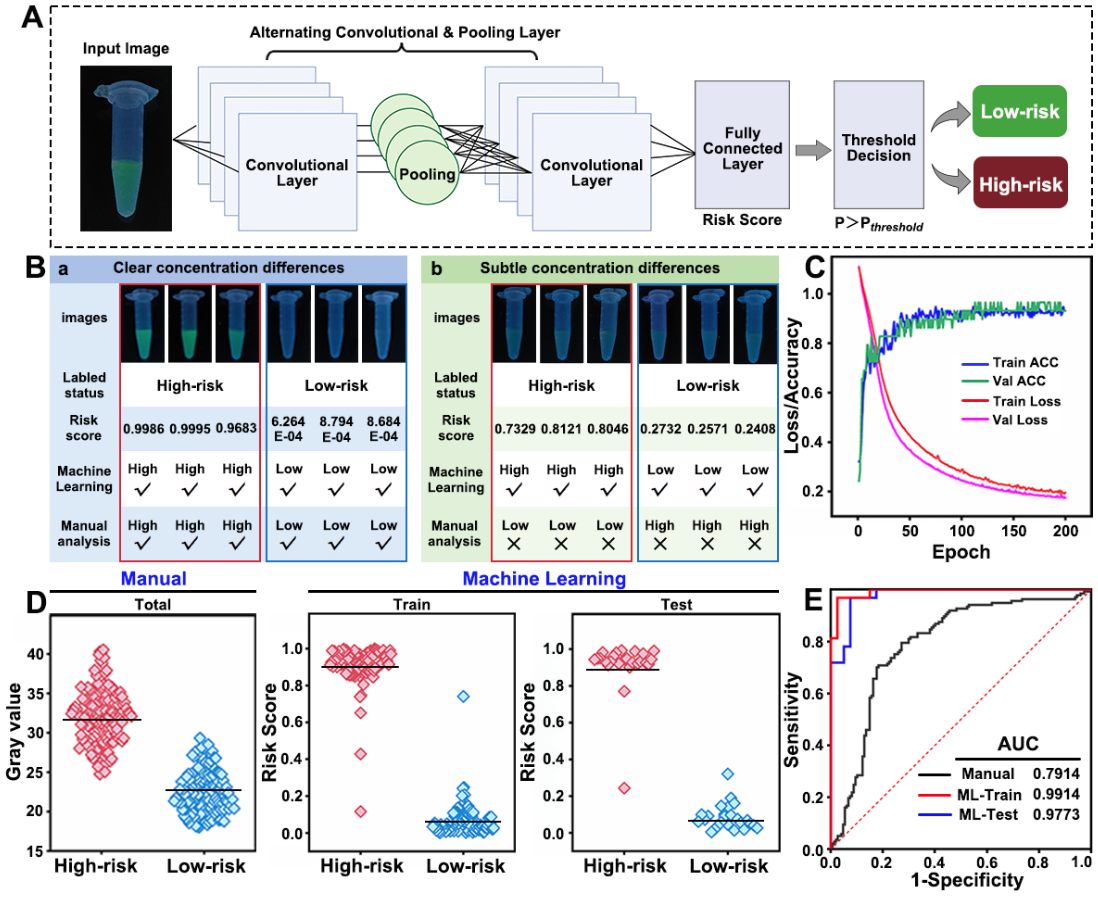 在以环境污染物全氟辛酸(PFOA)为模型的检测中,该分子诊断平台对PFOA的检测灵敏度较传统方法提升了52倍。同时,如图4所示,本研究还引入卷积神经网络(CNN)模型,通过对荧光图像空间特征的提取,实现了对阈值附近样本的精准区分。CNN模型将盲测样本分类准确率AUC值从79.1%提升至97.7%。