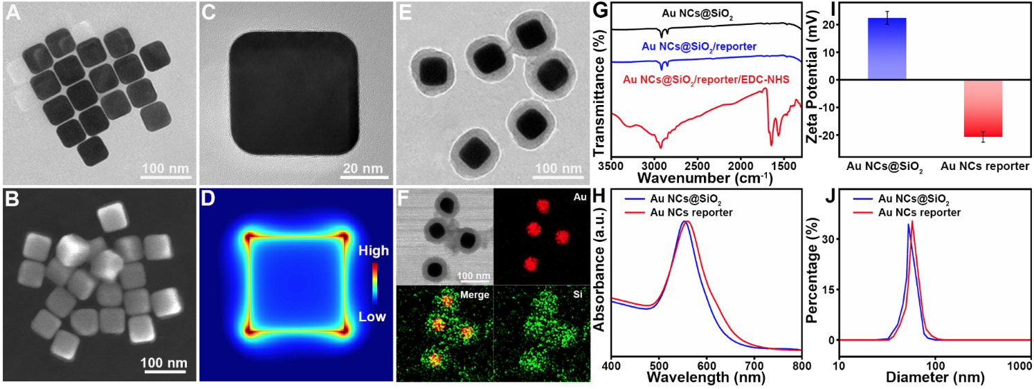 图2 金纳米立方体的透射电镜、扫描电镜等表征以及金纳米立方体报告子的红外光谱、Zata电位、吸收光谱及DLS表征。