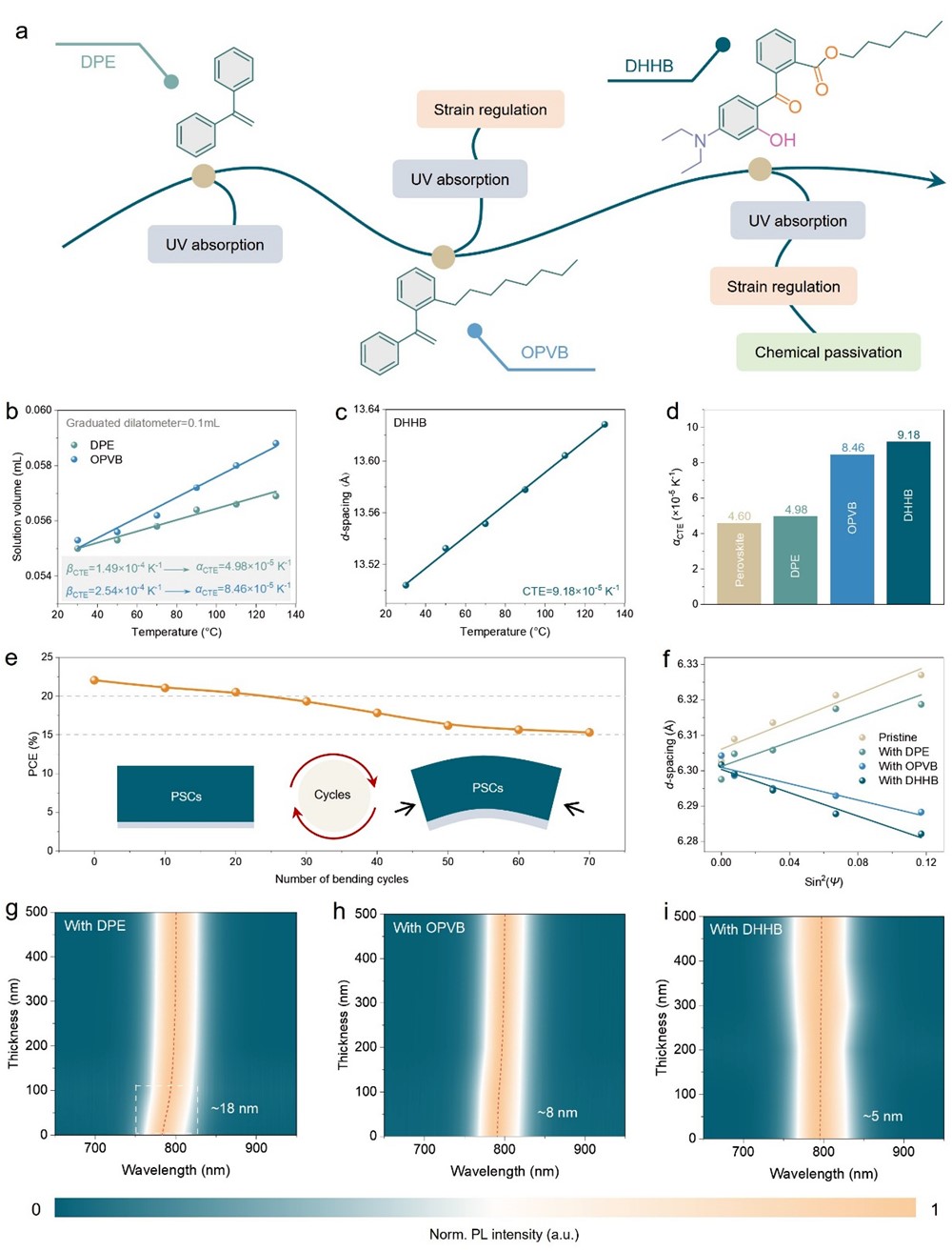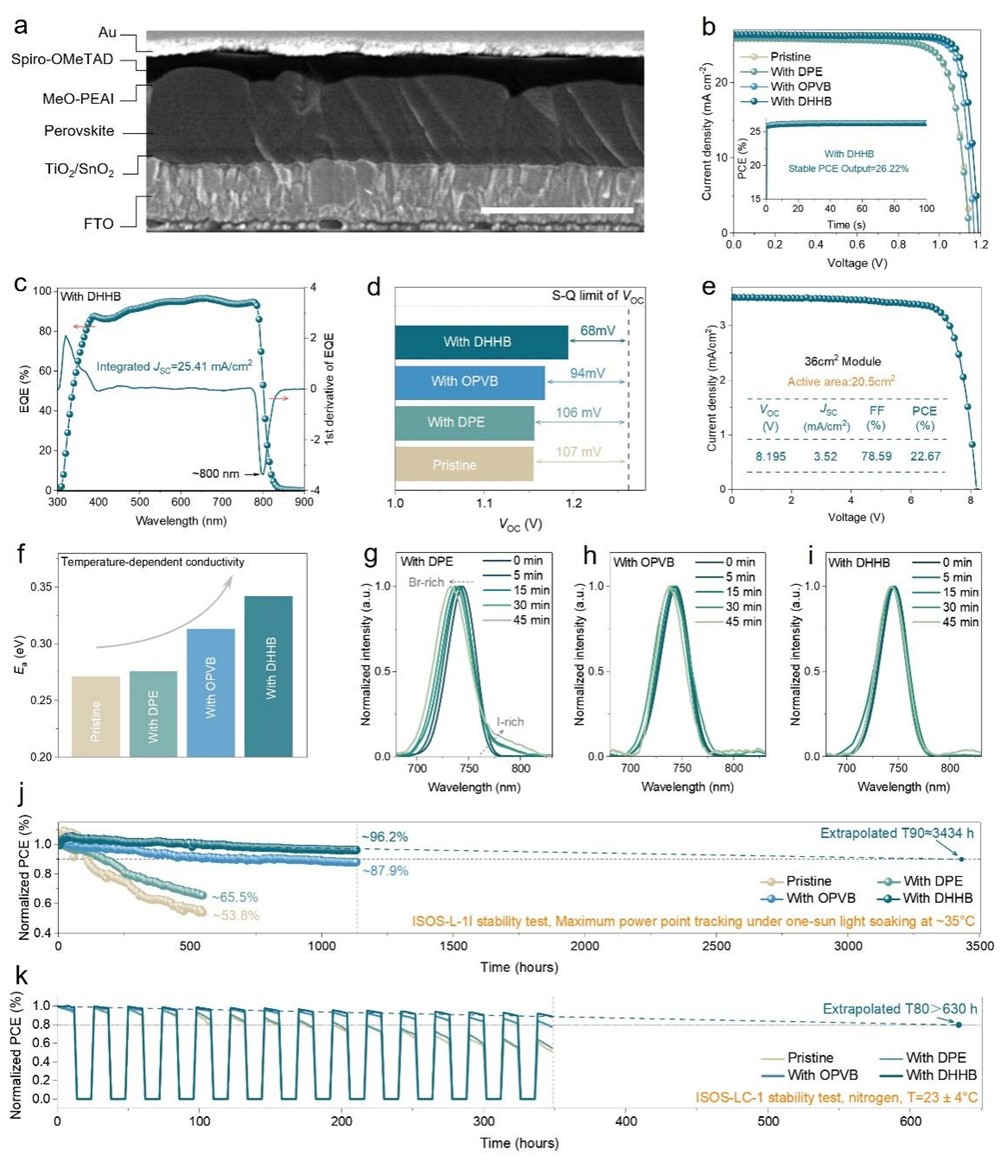 为此,周忠敏教授团队联合中科院青岛能源所逄淑平研究员、东南大学李崇文教授、上海交通大学王言博教授提出了一种针对钙钛矿太阳能电池埋底界面的构象工程策略,通过从1,1-二苯乙烯逐步演化为1-辛基-2-(1-苯基乙烯基)苯和二乙氨基羟基苯甲酰己基苯甲酸酯,构建了一个多功能分子系统。该研究系统解耦了这些添加剂在紫外屏蔽、应变调控和化学钝化方面的独立贡献,并结合原位表征技术揭示了光暗循环过程中动态界面应变调控对提升器件稳定性的关键作用。所制备的器件在0.09平方厘米和20.5平方厘米有效面积下分别实现26.47%和22.67%的光电转换效率,并在ISOS-L-II连续光照测试1132小时后保持96.2%的初始效率,在ISOS-LC-1昼夜循环测试348小时后保持88.8%的效率。该研究为通过构象工程驱动的多功能策略设计高稳定性钙钛矿太阳能电池提供了创新范式。