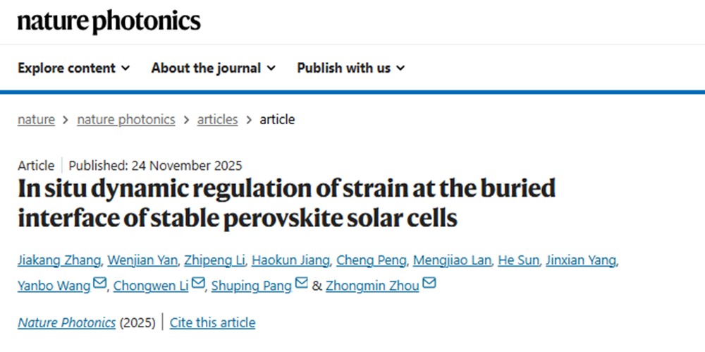 11月24日,高性能有机光学聚合物与先进制造全国重点实验室周忠敏教授团队在Nature Photonics期刊发表题为“In situ dynamic regulation of strain at the buried interface of stable perovskite solar cells(稳定钙钛矿太阳能电池埋底界面应变的原位动态调控)”的研究论文。