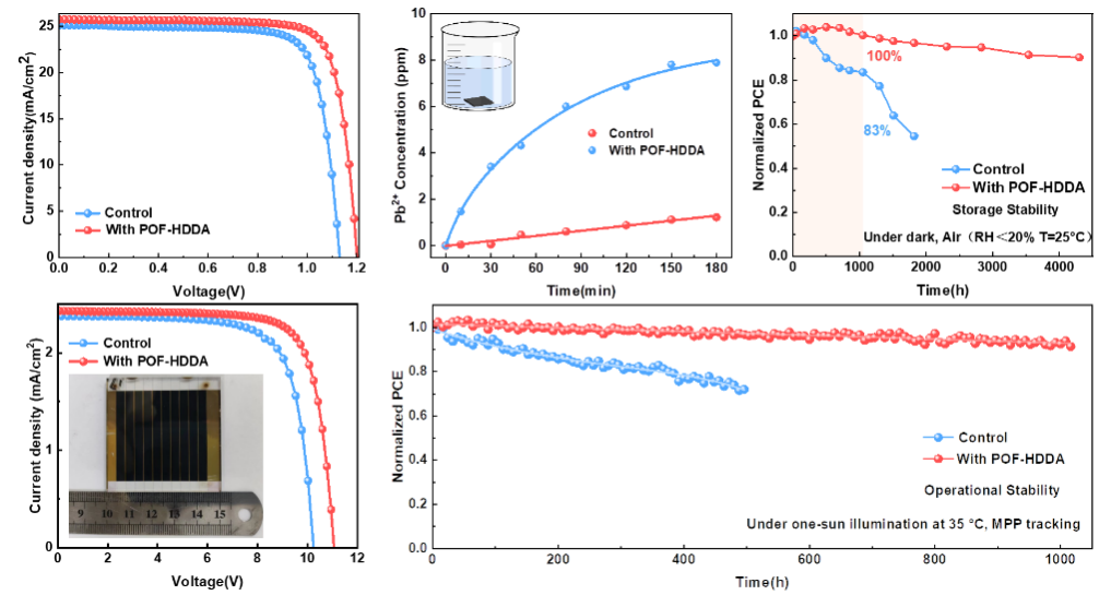 yl23455永利集团周忠敏教授团队与合作者报道了一种有机小分子单体八氟-1,6-己二醇二丙烯酸酯(OF-HDDA)引入钙钛矿薄膜通过末端烯烃发生原位交联形成聚合物(POF-HDDA),获得高性能高稳定性且低铅泄漏的器件与模组。POF-HDDA克服了小分子波动大、扩散系数高、在钙钛矿内部分布不均匀等缺点。该文章提出了通过热交联形成聚合物的策略,羰基锚定钙钛矿中未配位的Pb2+,减少铅的泄漏。同时通过钝化内部Pb相关和I相关缺陷调节钙钛矿膜的结晶,降低陷阱密度,释放晶格应变,促进载流子的运输和提取。进而获得高性能高稳定的低铅泄漏的器件和模组。
