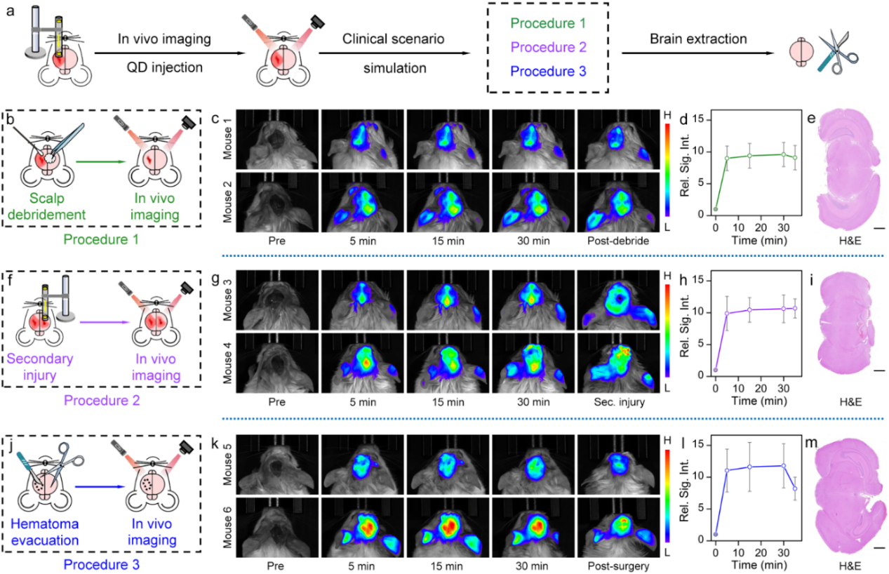 步验证基于量子点的光学成像策略在TBI临床管理中的实际应用价值,本工作模拟了三种常见的临床场景:1)颅内和浅表出血;2)继发性出血;3)颅内血肿手术清除,并通过量子点进行实时可视化检测。在体成像结果表明,通过近红外光学成像,可以显著区分损伤是否位于颅内,实时监测二次出血的发生位置和范围,并确认血肿是否被有效清除(图4)。
