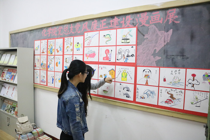 6月6日下午,化学院党总支 “党风廉政建设漫画展”在“五星党苑”特色党建活动室举办,化学院各党支部成员及部分学生干部代表参加了活动。