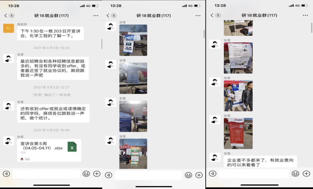 支部书记路燕(就业指导中心助理)积极转发招聘信息,为同学推荐企业,同时主动协调面试教室,为同学考博复试、就业面试提供场所。同时她积极参与基层就业,目前已成功考取选调生,结合自身经验为同学们答疑解惑。组织委员付卓林目前已被中国海洋大学博士预录取,积极与其他同学交流面试经验,同时他时刻关注一些事业单位、企业的招聘公告,并及时发送到微信就业群。