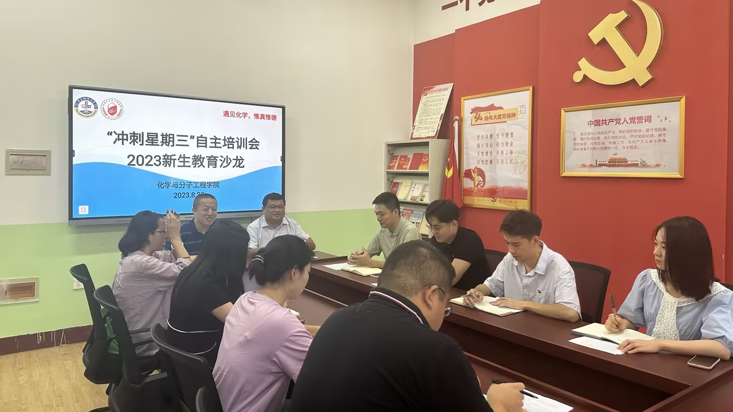 8月30日,化学院2023年度第三次自主培训在学院党建活动室举行。培训结合学院“冲刺星期三”工作品牌,聚焦“2023级新生教育”主题。学生处副处长宋飞、学工办全体辅导员、班主任代表、校学生会主席、院学生会主席、化学爱好者协会会长参加会议。会议由学院党委副书记杨小明主持。