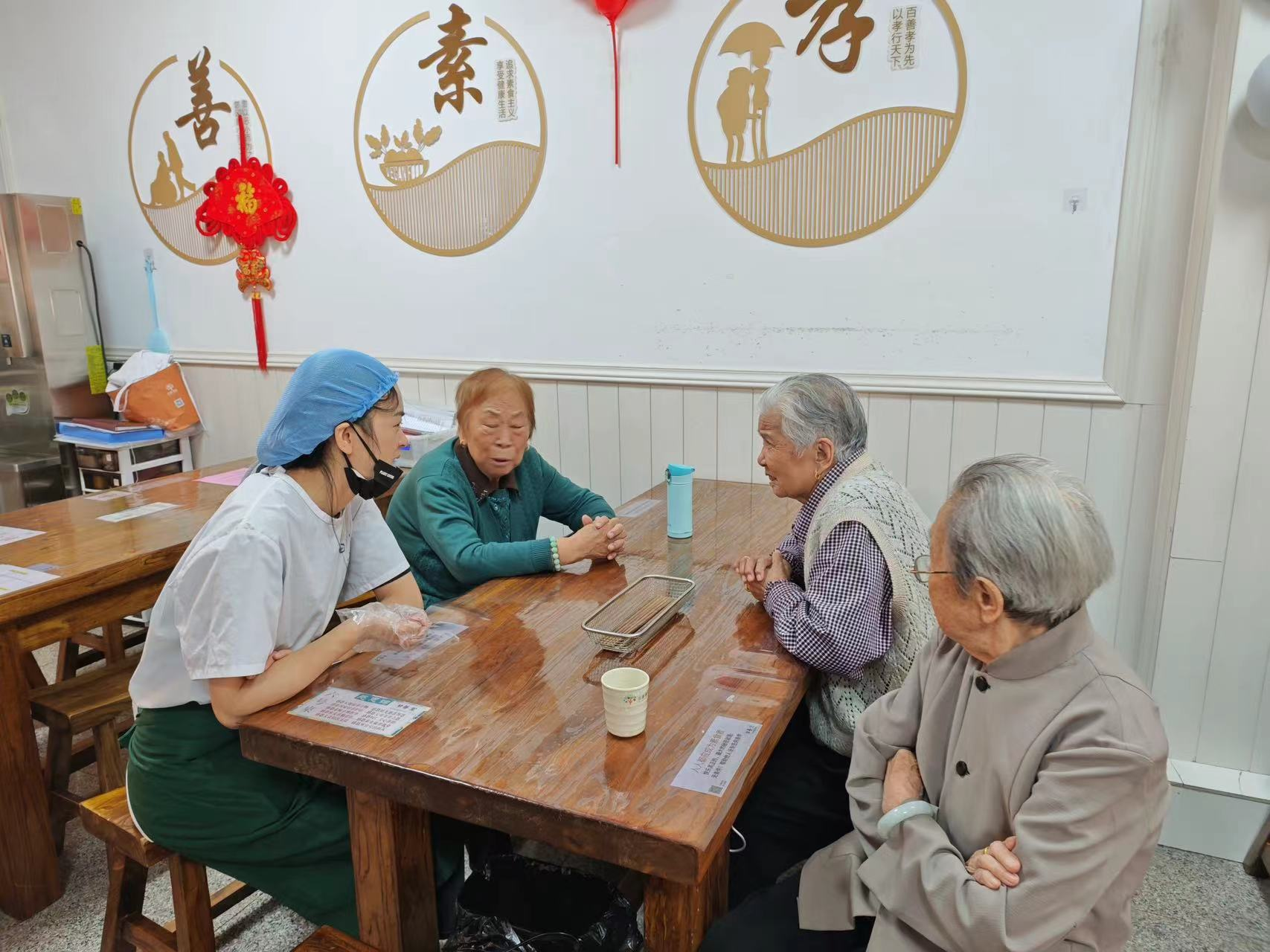 中午,志愿者们积极为前来用餐的老人服务,热情地在门口迎接老人,收取餐盒,分发餐食。期间,志愿者们与前来用餐的老人一起聊家常,了解他们的需求和生活现状,以实际行动为老人送去暖心祝福和贴心服务。午餐前,值班店长和志愿者们带领老人进行手指舞、扭秧歌等互动游戏,不仅能够锻炼老人身体协调性,预防多种老年性疾病,还能拉近大家之间的距离,为老人传递健康的生活理念。志愿活动结束后,日善堂负责人向志愿者们表达了感谢,并与志愿者们一起分享心得体会。