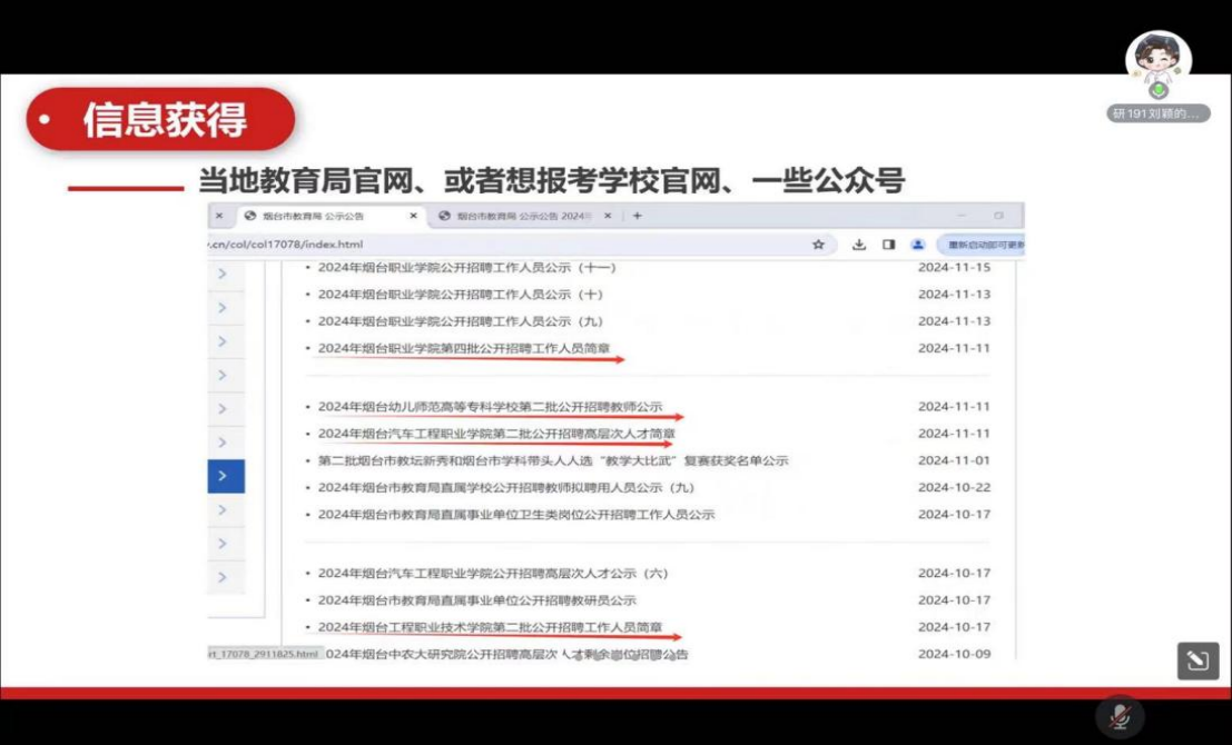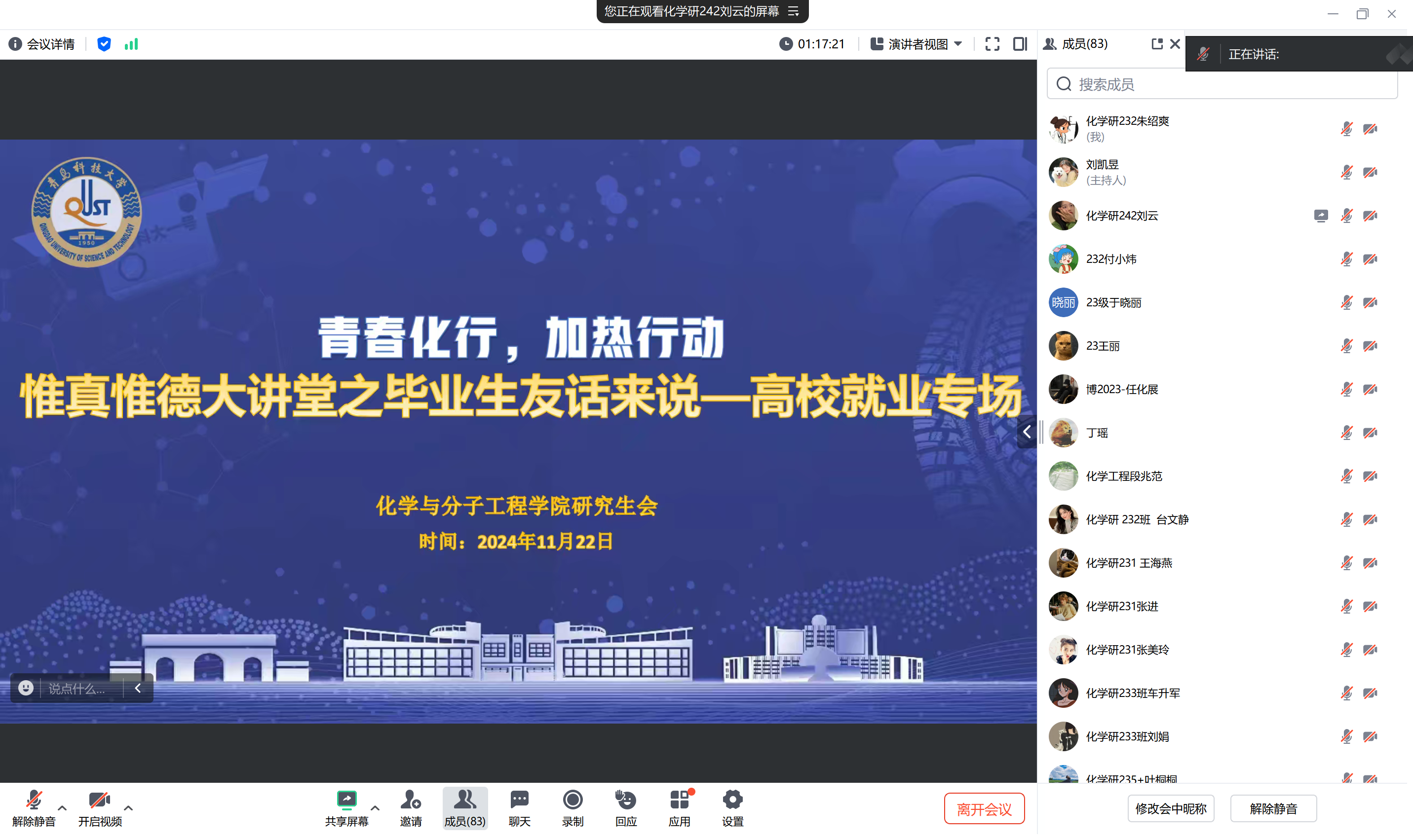 2024 年 11 月 22 日,化学院研究生会学术部成功举办 “青春化行,加热行动” 惟真惟德大讲堂之毕业生“友话来说”活动,本次活动以高校就业专场和科研院所专场为核心,为化学学院研究生精心打造了一个与杰出校友深入交流、汲取宝贵就业经验的高端平台。活动邀请了来自不同职业路径的杰出校友,向学生分享其工作和求职经验。整个活动通过线上腾讯会议平台进行,由刘云担任主持人,吸引了众多化学院研究生踊跃参与。