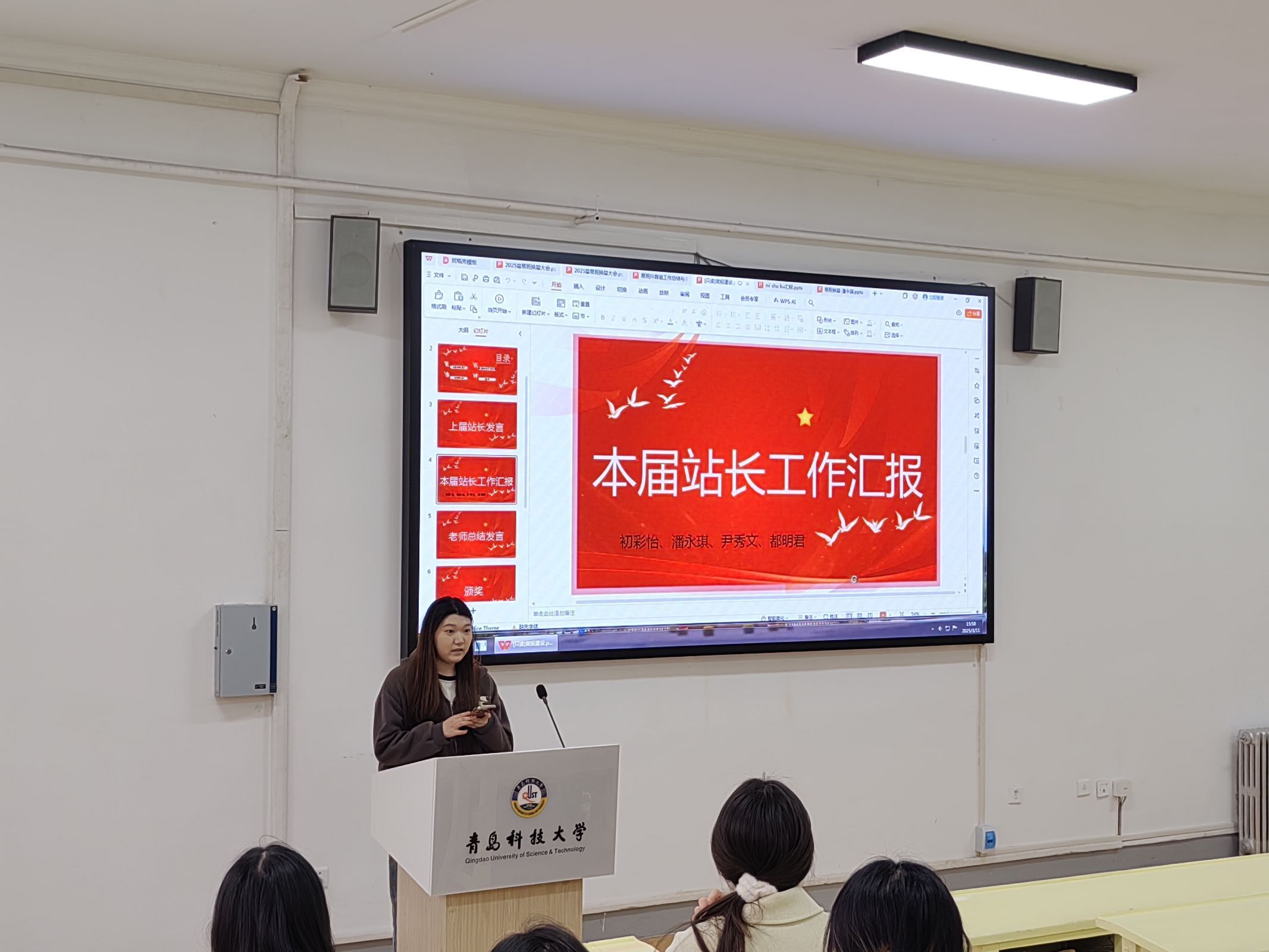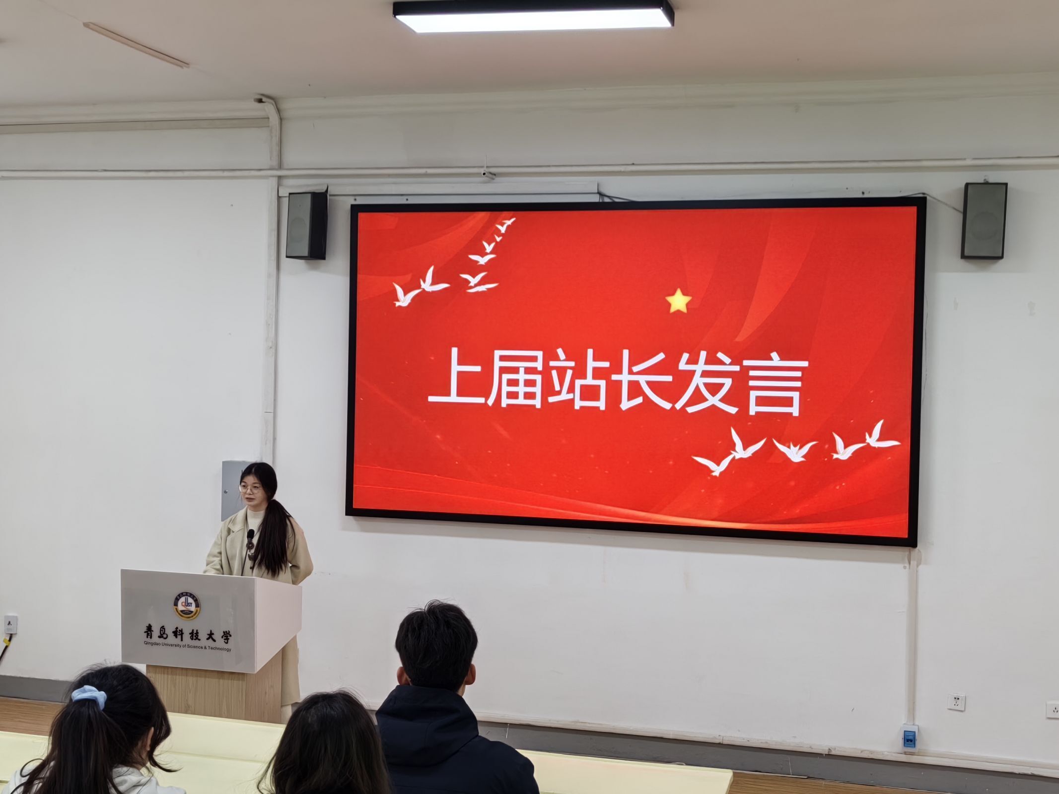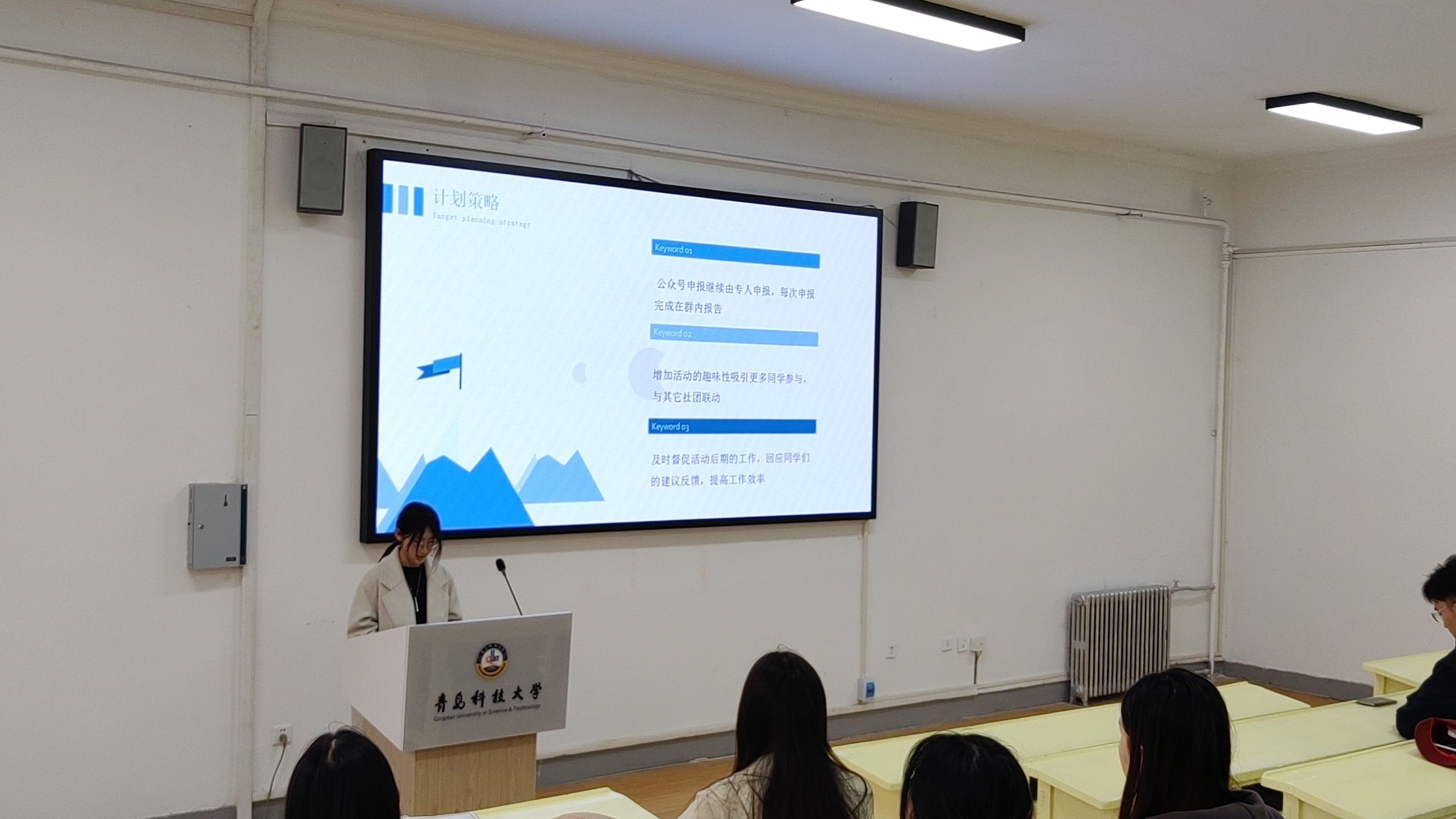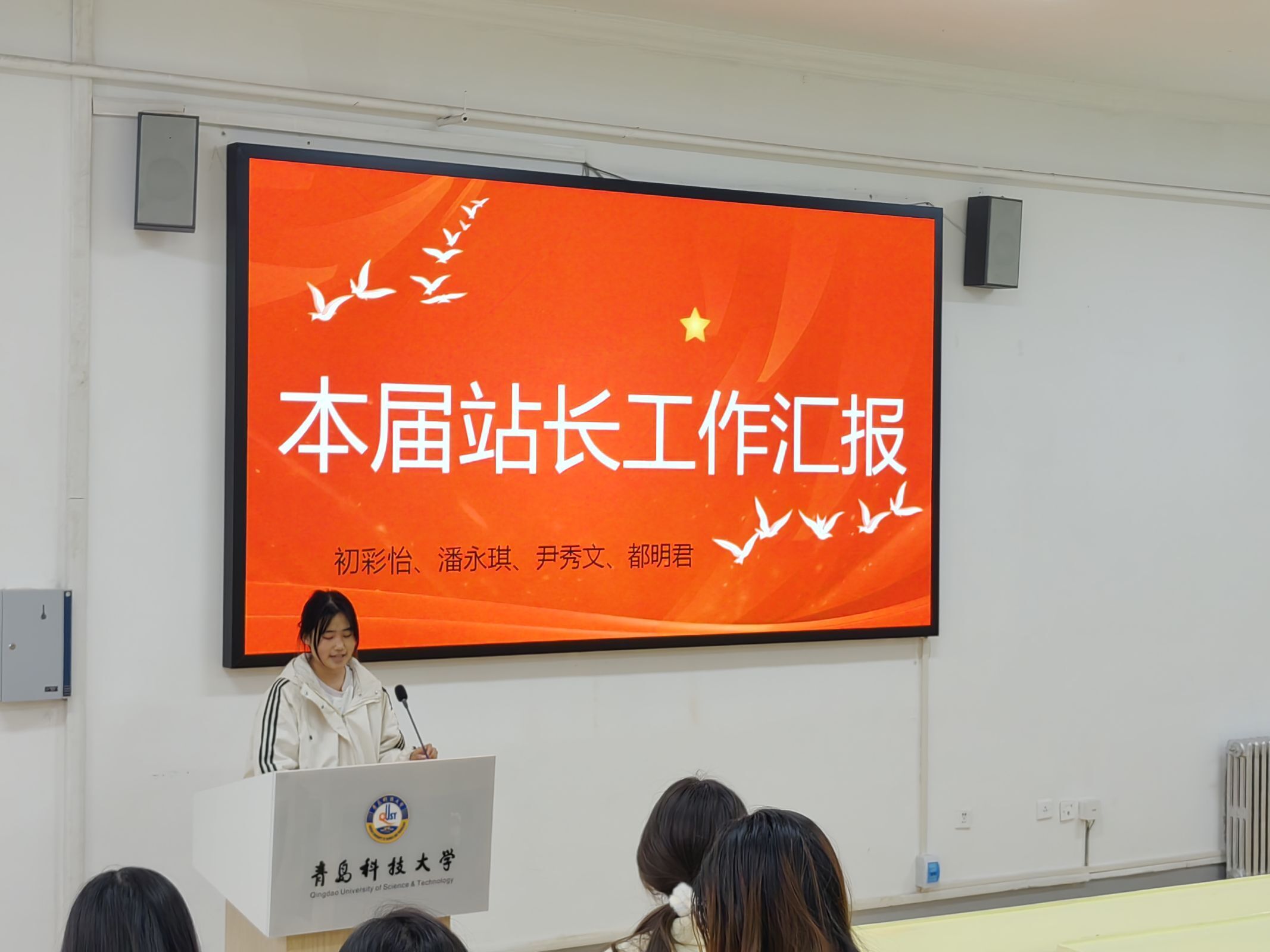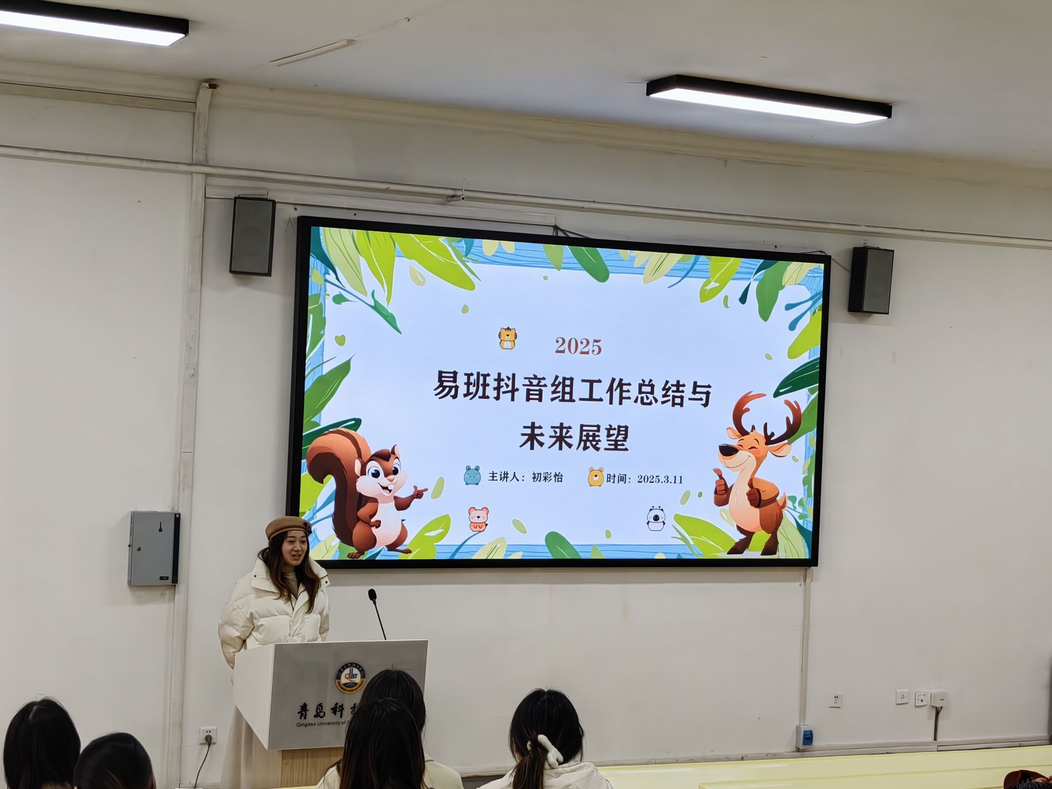 抖音部新任站长初彩怡对抖音运营部分作出汇报。她分三个方面进行汇报,对组内成员过去一年的努力和成果表示了认可,同时她提出要提高内容的创新性和多样性,与网络热点保持一致,还要提升成员视频拍摄、剪辑和配乐的能力,为易班共建添砖加瓦。