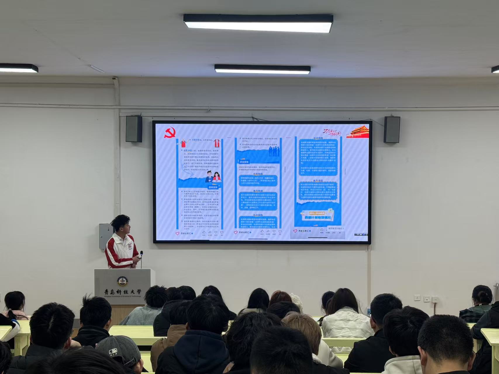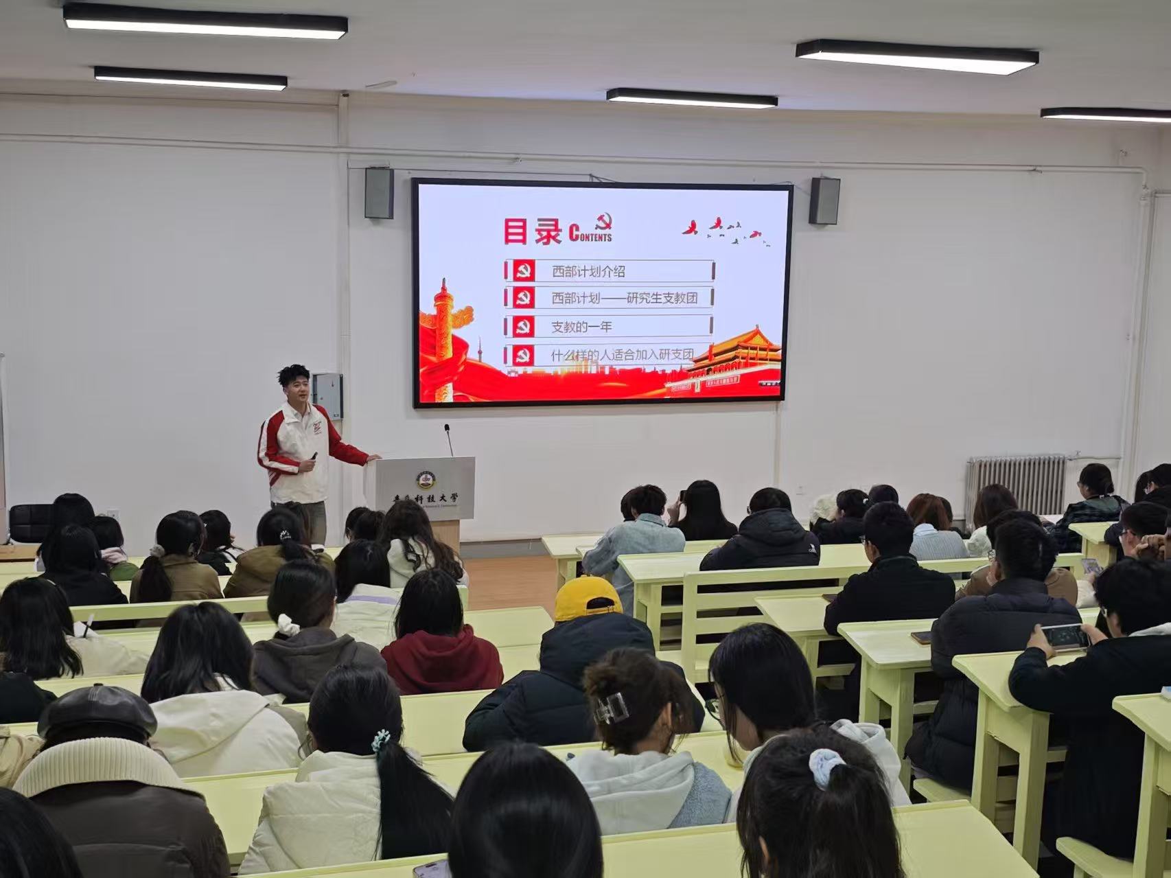 宣讲会系统介绍了2025-2026年度西部计划的政策要点,包括招募对象、八个服务专项、报名流程及社会保障等内容,着重解读了研究生支教团项目的选拔标准与服务要求。通过生动的政策讲解、真实的案例分享和丰富的影像展示,全面展现了西部计划的服务内涵,有效激发了学生们投身祖国西部建设的热情。