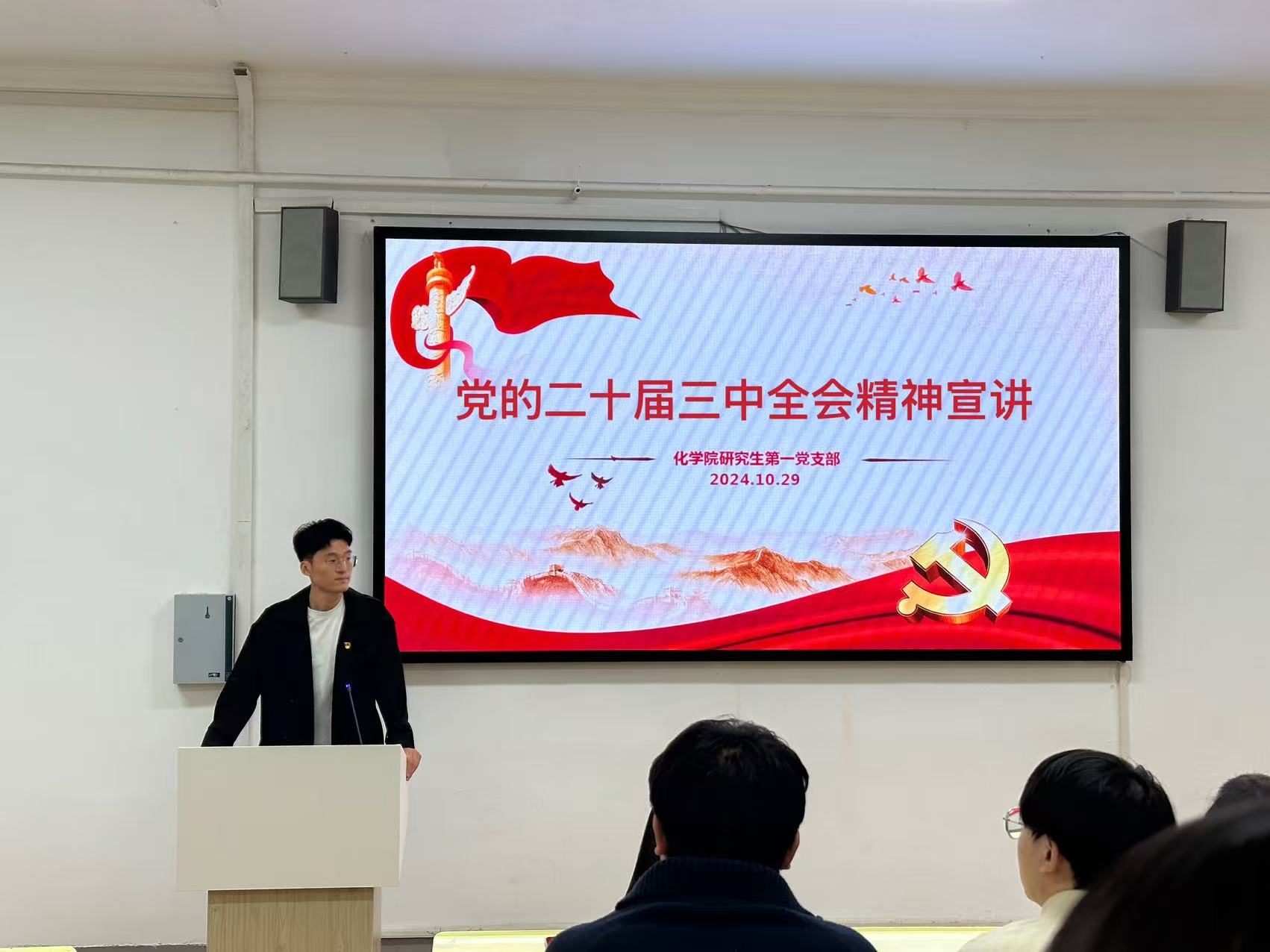 为深入学习贯彻党的二十届三中全会精神,推动全体党员进一步提升政治理论水平,化学院研究生第一党支部于2024年10月29日召开了专题学习讲座。主讲人张高鹏,全体党员踊跃参加,积极聆听和讨论。