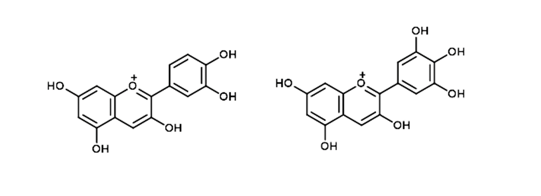 本实验从玫瑰花中提取的花青素以矢车菊素(Cyanidin)为主(结构见图2),其分子中羟基(—OH)取代基的数量与位置直接影响显色特性。而三色堇(Viola tricolor)的蓝紫色花瓣中则富含飞燕草素(Delphinidin)(结构见图2),其较矢车菊素多一个羟基基团,增强了分子共轭体系,导致最大吸收波长向长波方向偏移,显色更偏蓝调。