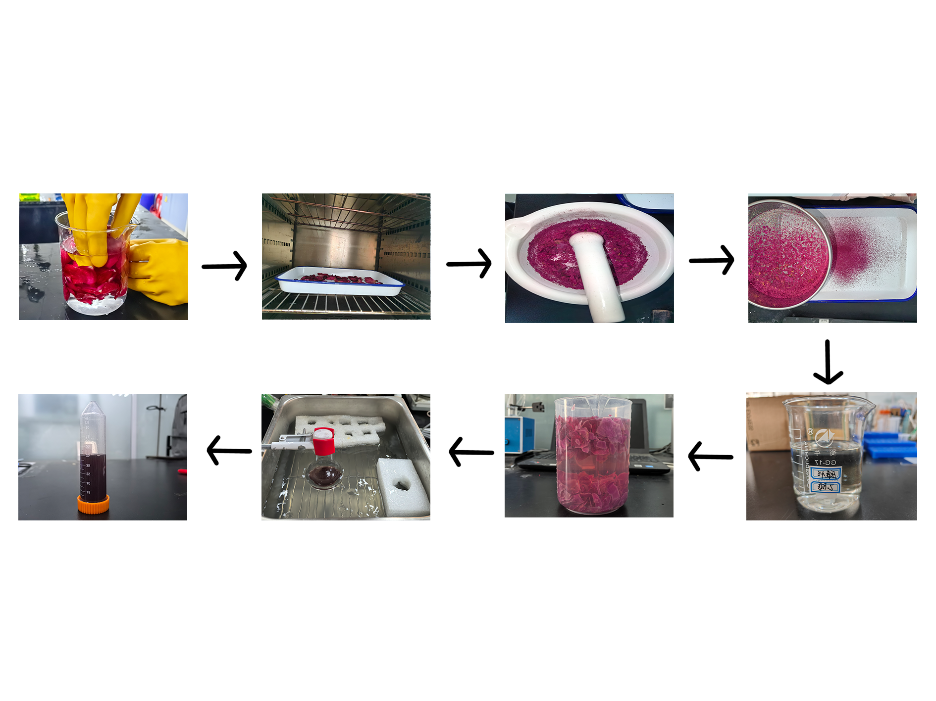 (1)原料预处理: 将玫瑰花花瓣瓣放入盆中,用流动清水轻轻漂洗2-3次,去除灰尘和昆虫(清洗去杂)。避免揉搓或长时间浸泡,防止色素流失。用剪刀将花瓣剪成碎片(或用菜刀切碎),增大接触面积(破碎处理)。 (2)花青素提取: 倒入准备好的热水,但避免加入的是高沸的沸水,防止高温破坏花青素(加入热水)。再向溶液中加入1汤匙白醋或半个柠檬挤汁,搅拌均匀,静置待玫瑰花瓣沉淀。用纱布或滤茶袋过滤,挤压花瓣残渣至无液体滴落。得到上层液体即为花青素粗提取液。