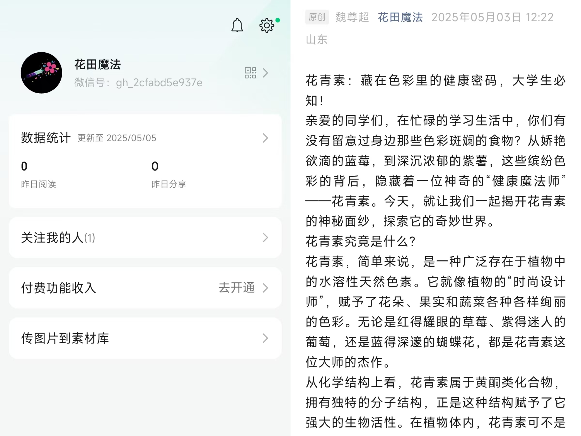 针对普通大众的知识水平和阅读习惯,撰写一系列深入浅出的科普推文。推文内容可以从日常生活角度出发,介绍花青素对人体健康的益处,如抗氧化、预防心血管疾病等;分享如何在日常饮食中摄入更多富含花青素的食物;辟谣一些关于花青素的常见误解等。推文中适当插入生动有趣的图片、表情包等元素,增加推文的趣味性和吸引力。 制作时长较短的科普小视频。视频内容聚焦于花青素的某个知识点或有趣的实验现象,如“在家就能做的花青素变色小实验”“一分钟了解花青素的神奇功效”等。视频风格要简洁明了、生动活泼,通过动画、实景演示等多种形式快速传达核心信息,适合大众在碎片化时间内观看学习。将这些科普小视频发布在各大社交媒体平台上,扩大科普覆盖面。