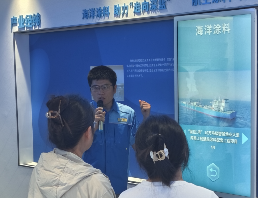 作为我国海洋化工领域的“国家队”,海洋化工研究院拥有行业唯一的海洋涂料国家重点实验室,其自主研发的尖端涂料产品已广泛应用于船舶工业、航空航天等关键领域,多项技术打破国际垄断,为我国装备制造业发展注入强劲动能。在科普展厅,王效军博士通过专业讲解与动画演示,生动阐释了从材料设计到工程应用的完整创新链条,让书本知识跃然眼前。