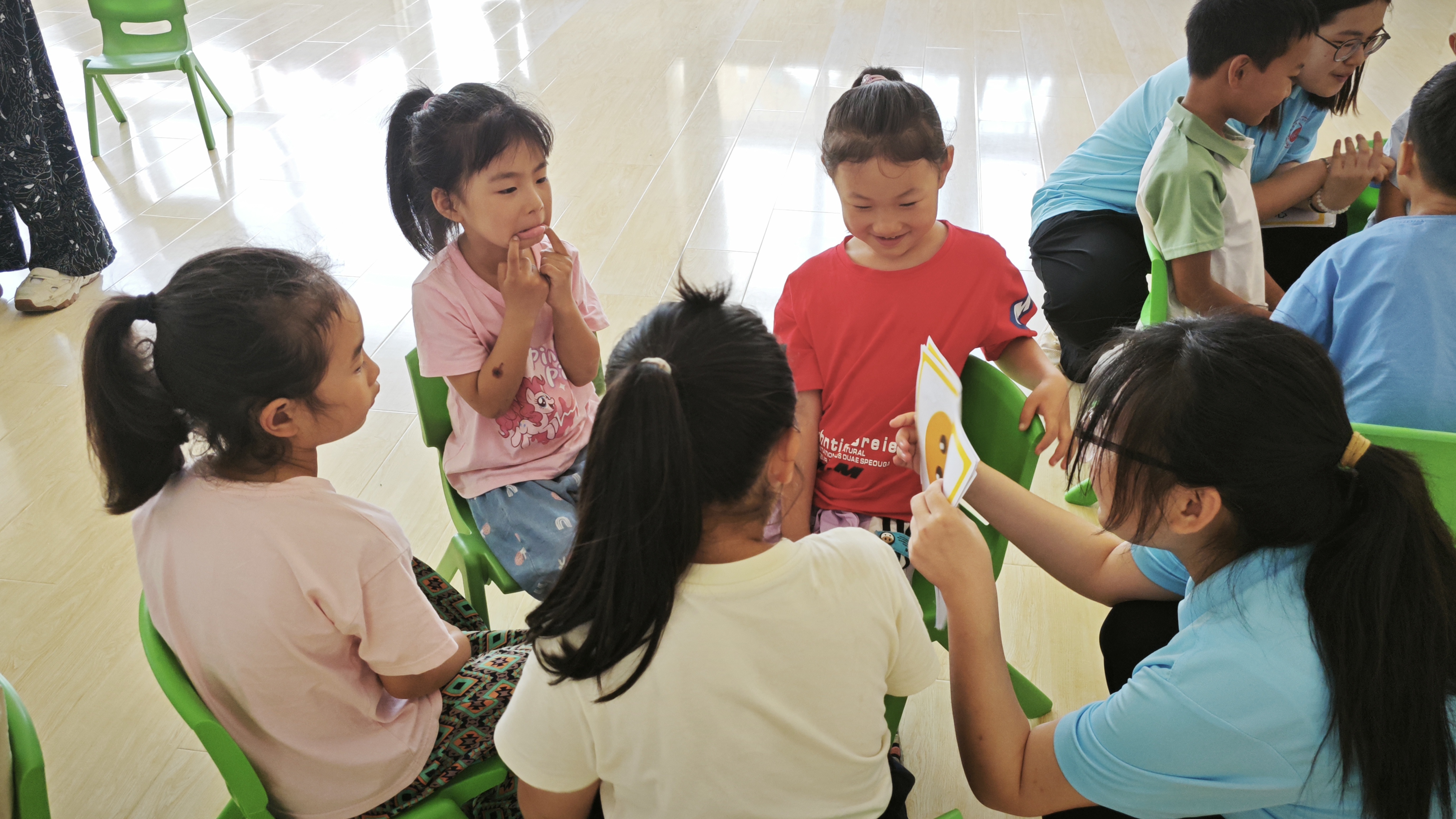 活动伊始,志愿者们进行了简单的自我介绍,随后开展了“水果接龙”破冰游戏。志愿者与儿童围坐成圈,按照“我喜欢苹果”的句式进行接龙挑战。在游戏过程中,孩子们全神贯注,努力记住上一位伙伴的表述内容。部分孩子因紧张出现说错的情况,引发了阵阵欢笑。此外,还有小朋友主动表演节目,进一步将现场气氛推向高潮。通过这一轻松愉快的互动环节,志愿者与孩子们之间的陌生感逐渐消除,孩子们迅速打开心扉。融入集体。