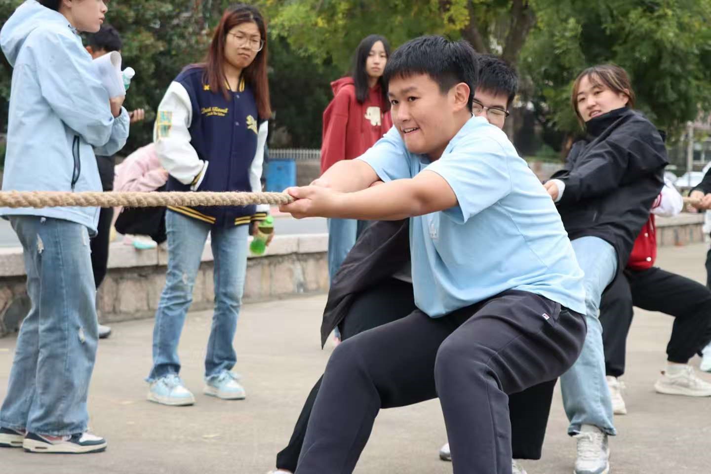 比赛现场氛围热烈如火,各队选手摩拳擦掌、斗志昂扬。随着裁判一声清脆哨响,比赛正式开始。双方队员瞬间发力,身体奋力后倾,拼尽全力向己方拉扯绳索,每一局都堪称惊心动魄的较量,也拉近了同学们之间的距离。