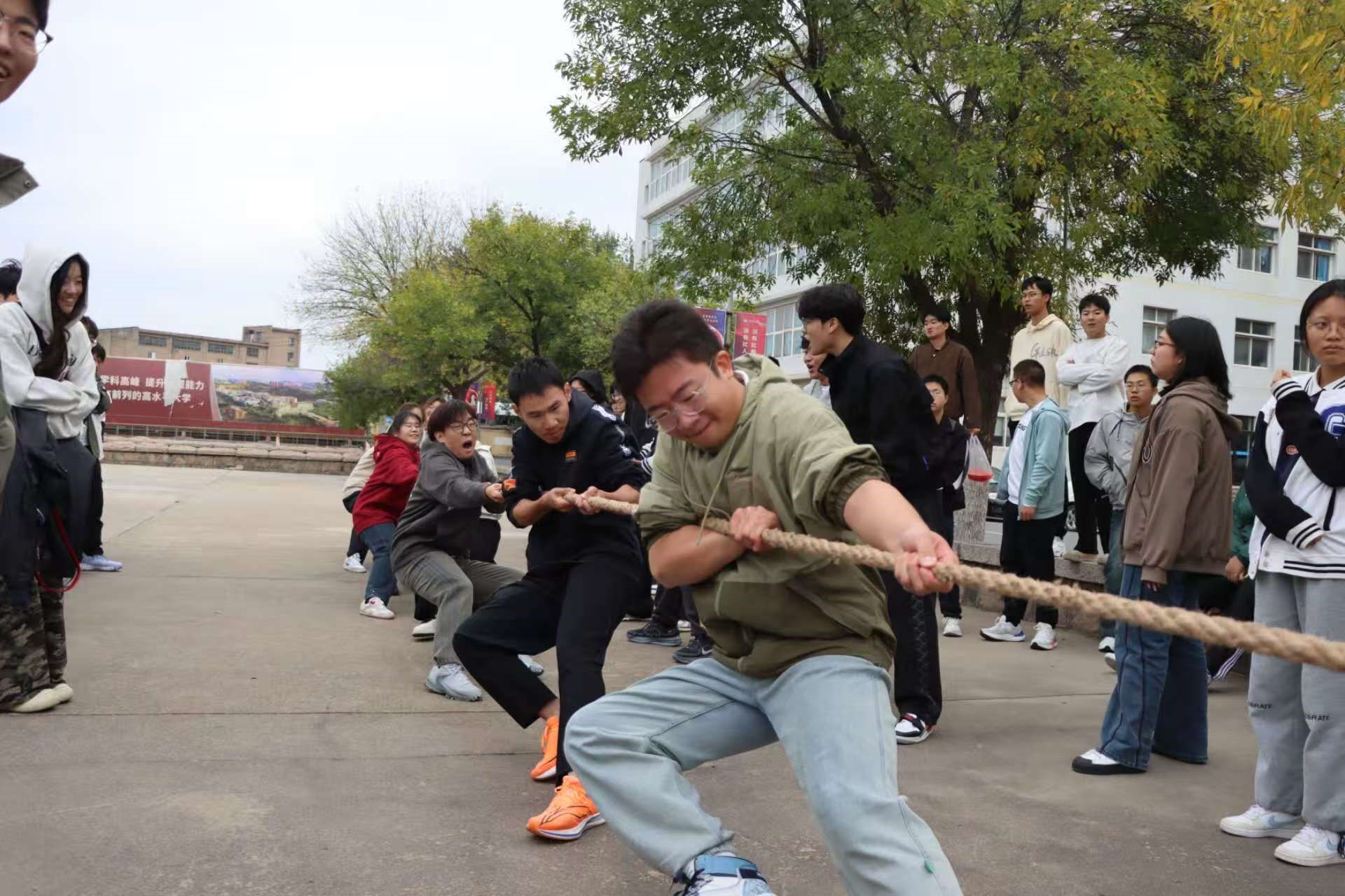 为响应“爱体育,兴科大”校园体育文化号召,丰富校园文化生活,展现班集体卓越风采,增强班级凝聚力,化学院于2025年10月19日在小五四广场组织2025级学生开展了一场热血沸腾的拔河比赛。本次比赛以班级为单位进行角逐,14支队伍踊跃参赛,每支队伍由5名男生和4名女生组成,通过抽签分组确定比赛顺序。