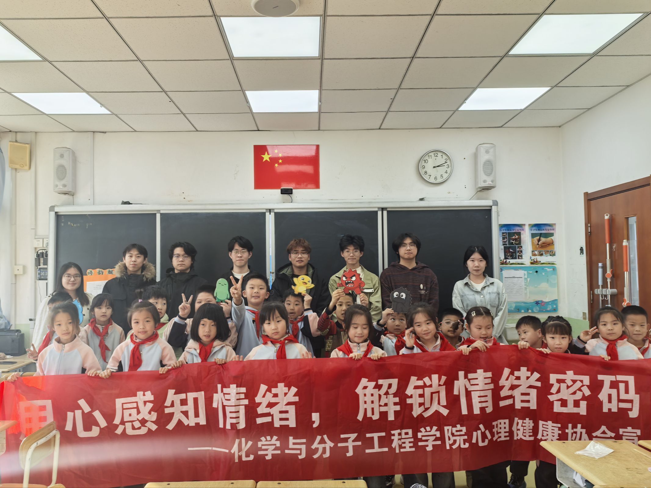 活动最后,志愿者与孩子们集体合影留念,定格下充满欢笑的瞬间。此次活动为校园科普与心理健康教育提供了新思路,化学院志愿者团队也将进一步总结经验,为后续志愿服务积累实践基础。(一审:马晓风;二审:王森;三审:刘尧)