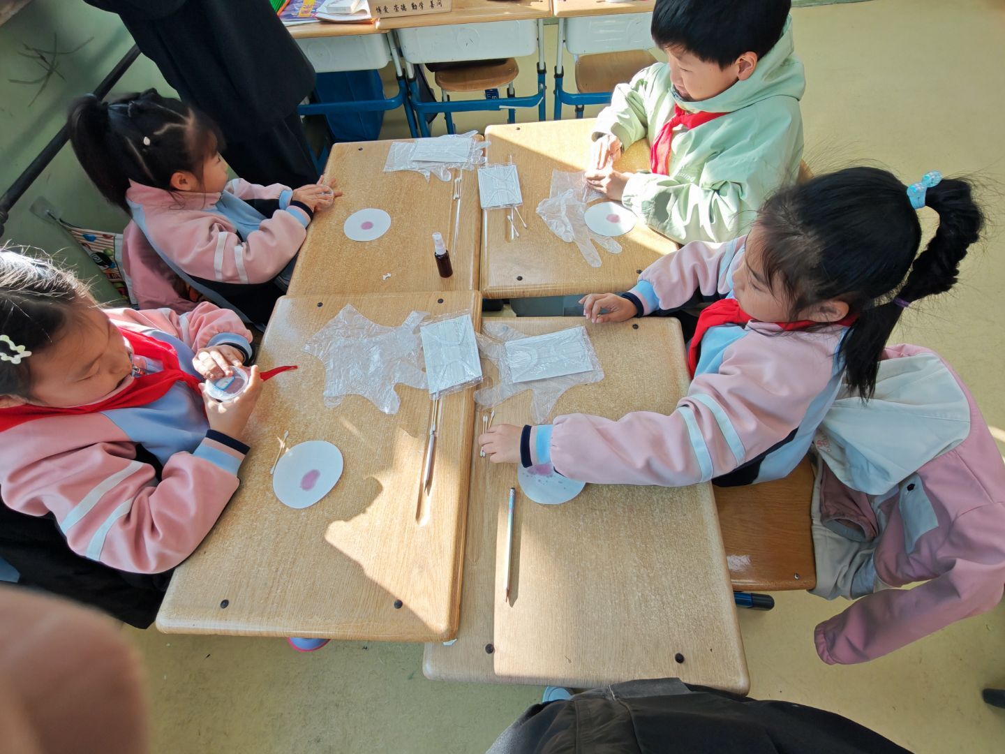 课程伊始,志愿者们首先通过生动的实验演示,向小学生们展示了花青素在不同pH值环境下的颜色变化。当看到紫甘蓝汁在加入柠檬汁、小苏打水后瞬间变换出红、绿等不同颜色时,孩子们发出阵阵惊叹。“就像变魔术一样!”学生小张在观察实验时兴奋地表示。