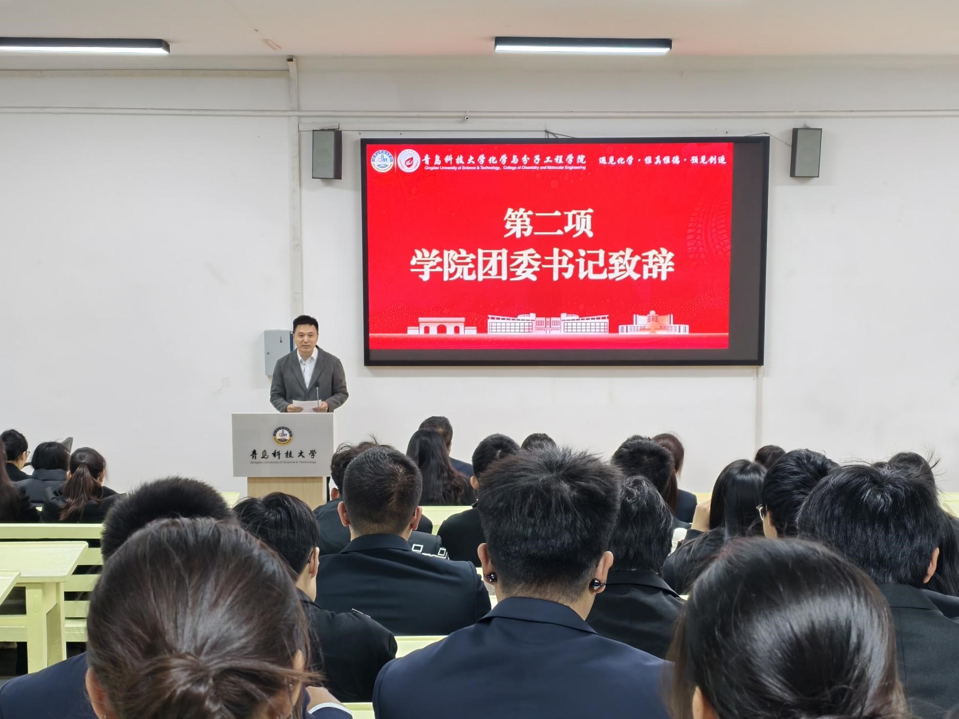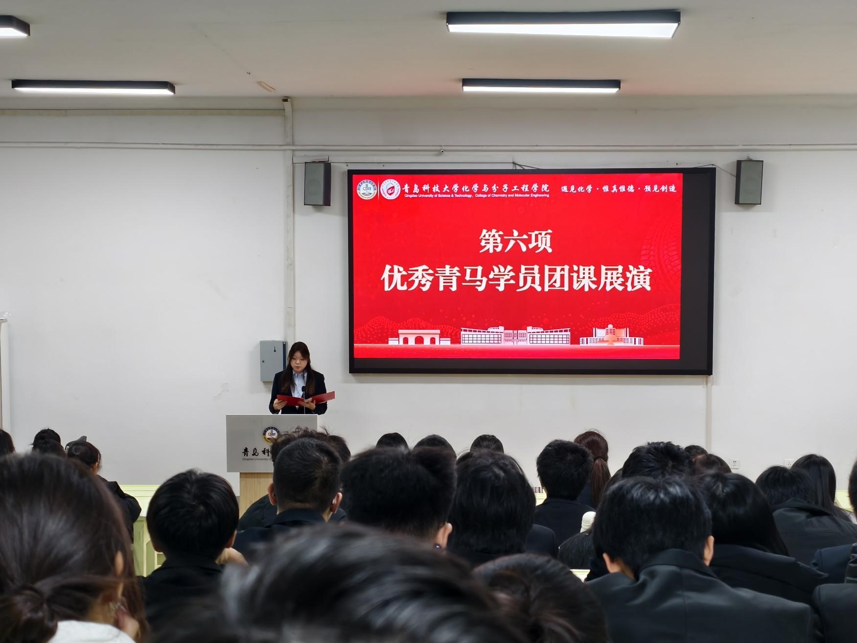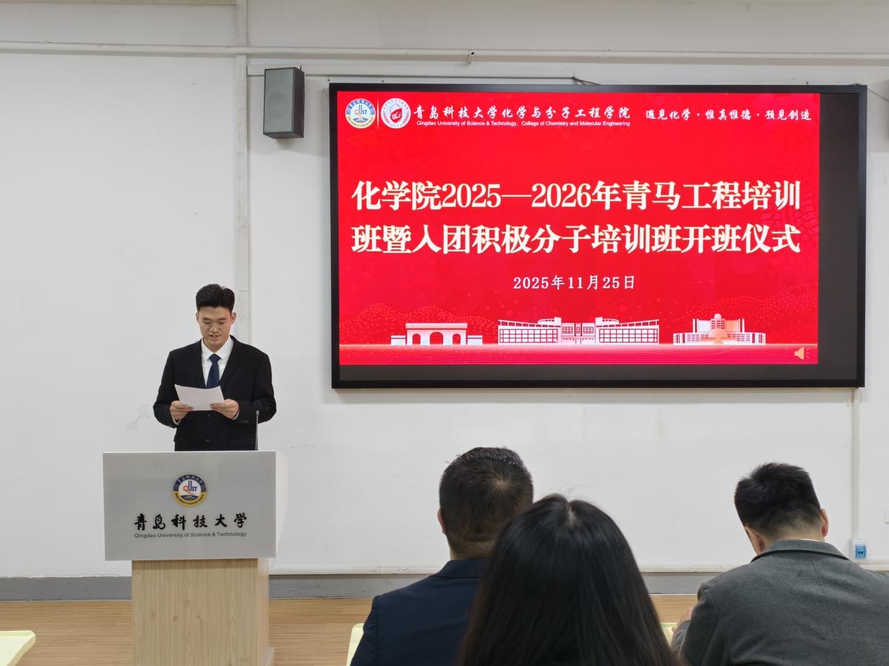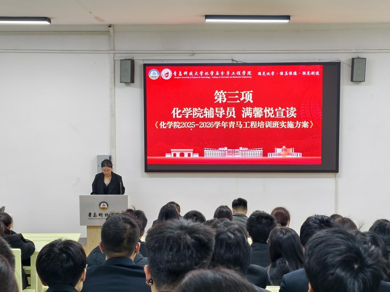闵繁盛上台致辞、满馨悦宣读《化学院 2025-2026 年青马工程培训班实施方案》、信连涛上台发言,表达参与本次培训的坚定决心与学习信心。