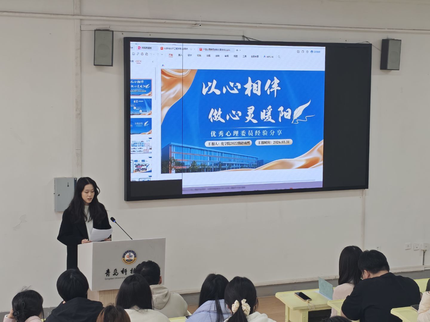 本次分享会邀请校十佳心理委员、应化222班赵雨然同学分享经验。赵雨然学习成绩优异,现已被推免至湖南大学院士团队,同时还担任班级心理委员与心协部长,用专业与热忱守护同学们的心灵。她结合自身工作经历,从自我成长、工作成果、全面发展三个维度详细介绍了自己在班级心理工作中的实践与感悟,分享既有理论支撑,又有实践案例,生动展现了一名优秀心理委员的责任与温度。