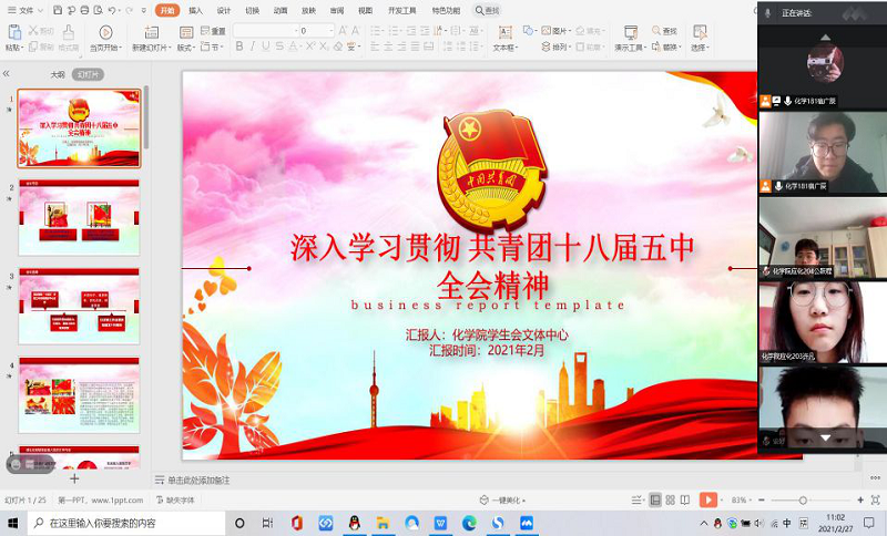 2021年2月18日,化学院文体中心、学术中心分别举行“关于组织全校团员青年深入学习贯彻,共青团十八届五中全会精神”线上学习会议。