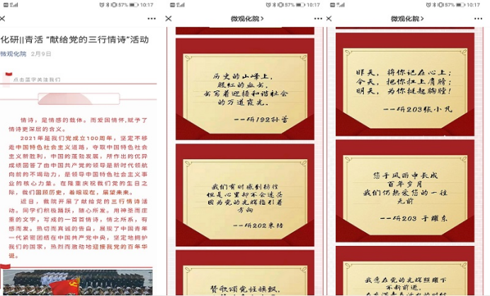为扎实推进青年学生思想政治引领及红色文化教育,响应“学党史、强信念、跟党走”的号召,进一步加强党史教育,加强学生的思政素养,化学院研究生自2021年2月开始进行“学党史抒情怀 写红诗献给党”系列活动,以三行情诗献礼建党一百周年。