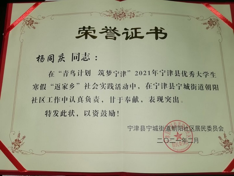 在“青鸟计划”实习锻炼中,8名化院青年学子也收获颇丰。其中,应化实验191杨同庆、化学实验201臧秀慧、应化中美202曾雅欣、应化204丁鑫、分子科学191王玉珍担任家乡疫情防控“宣传员”、“监督员”、“信息员”,积极参与到疫情防控一线工作中,对外来返乡人员路径进行登记,还协助社区汇总每天外来人员的数据信息。杨同庆曾在实践报告中写到:“通过这次社区服务,我提高了社会适应潜质和运用知识解决实际问题的潜质,增强了社会职责感和使命感,也扩大了视野,对自己有了清醒的定位,不仅仅发现了自己知识结构中欠缺的一面,也感受到了现实和理想的差距,这对我们的学习、生活和工作都有很大的启发。这是我参加此次青鸟计划实习的所得,也是迈向社会的第一步。” 应化中美192张林雪通过在当地气象局接触业务知识,也表明了为家乡做贡献的决心:“本次所有参与活动的青鸟学子对家乡近几年的变化有了深刻的认知,也深刻感受到了家乡未来发展的广阔前景,希望在不久的将来,我也能为自己家乡的发展贡献自己的力量。”张林雪还提出了用化学知识改善家乡环境和化工厂建设的几点建议。应化中美191林维轩在曲阜市公安局新冠疫情防控—随访工作专班岗位上发光发热,她在实践报告的感悟中写到“我就职于曲阜市公安局,在这里,我看到了在疫情面前冲锋在前、勇挑重担、迎难而上、枕戈待旦,以实际行动诠释非常时期公安队伍的责任和担当。”