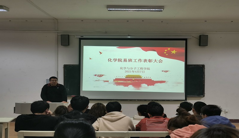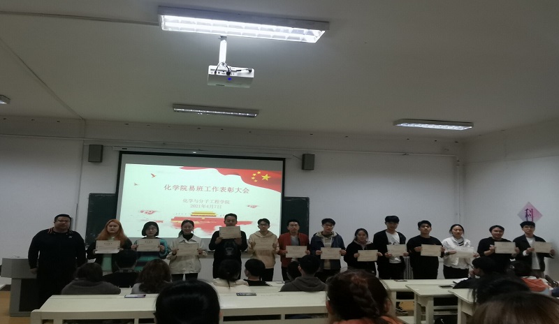 会上易班工作站站长张泽龙同学就学院本学期易班工作开展情况以及上学期易班工作进行总结和汇报,并发动同学们大力支持易班工作。随后,信连涛老师宣布了易班获奖班级、先进个人名单。18级施纯源同学、19级张泽龙同学荣获“最佳站长”称号,18级宋浩宇、张乐瑶等四人,19级任佳艺、司志栋等十四人,20级李梓航、朱祥菊等二十四人荣获优秀干事奖,化学实验201、应化中美202等九个班级荣获易班共建优秀班级奖。