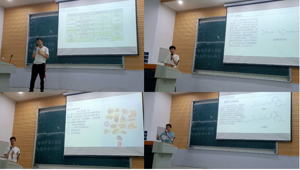 活动由化学爱好者协会曹亚龙主持。化学院党委副书记杨小明向活动致辞,希望同学们可以让知识与生活结合,真正的走进化学,热爱化学。首先由化学爱好者协会的耿晨博带来《食品添加剂》讲解,以身边实际情况为例,向大家普及食品添加剂的相关知识。之后由化学爱好者协会的段杰克开展《食品安全问题》讲解,其中重点讲解了亚硝酸盐与三聚氰胺的化学性质以及致病机理。随后由化学爱好者协会唐子杰就《合理膳食》开展讲解,并向大家介绍了中国营养学会为中国公民所设计的膳食宝塔。最后化学爱好者协会高圣杰就《生活常用药》开展讲解,介绍生活常用药作用基本情况,同时为大家讲解中草药的重要作用。