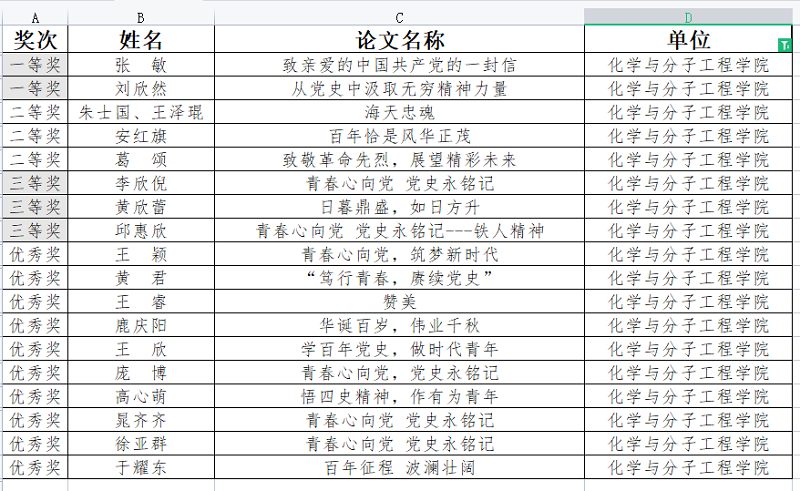 为了庆祝党的100周年华诞,学习和回顾中国共产党从诞生到发展壮大的光辉历程,讴歌中国建设发展成就,yl23455永利集团举办“青春心向党 党史永铭记” ——庆祝中国共产党成立100周年征文大赛。化学院精心组织、广泛动员,学生们积极响应、踊跃投稿,经过学校专家评审,化学院共有18件作品获奖,其中一等奖2项,二等奖3项,三等奖3项,优秀奖10项,化学院获评优秀组织单位。