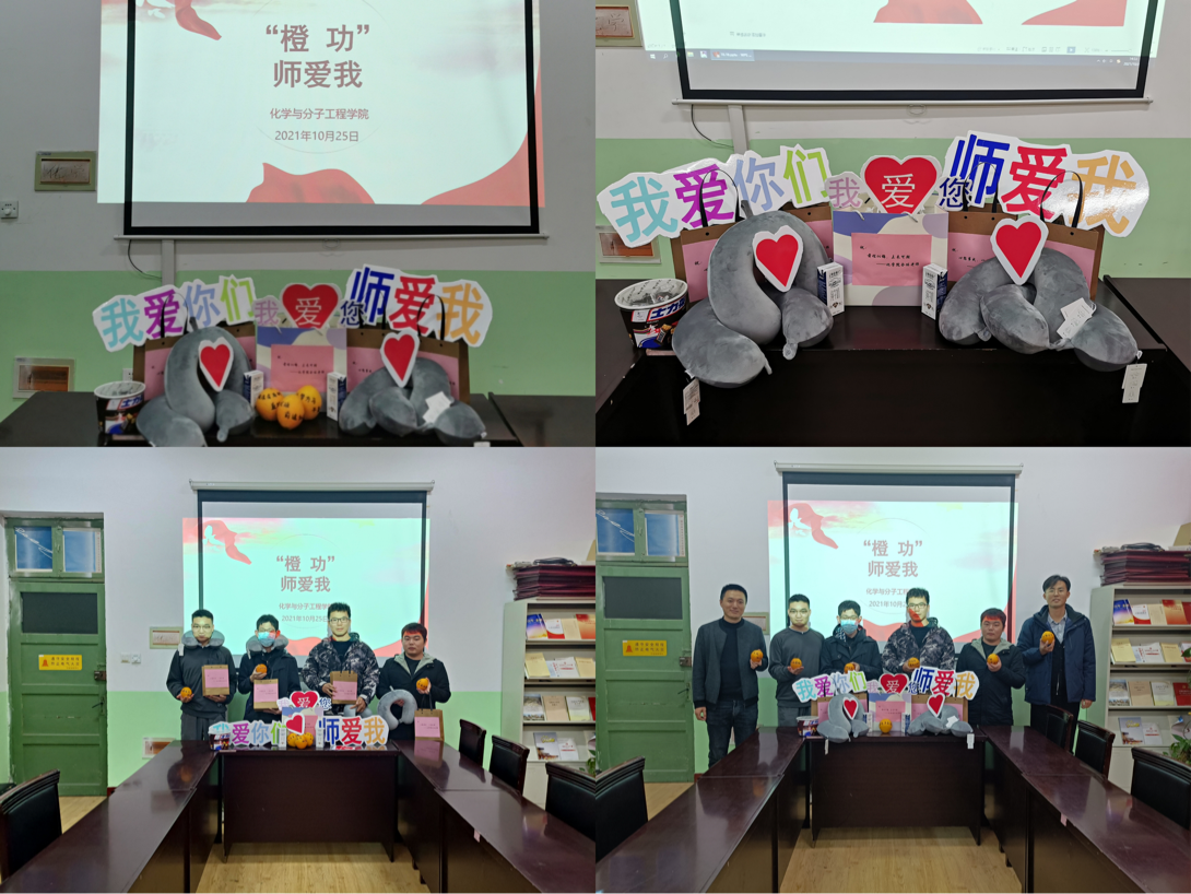 “橙功”师爱我活动。10月25日,化学院大四年级开展“橙功”师爱我活动,辅导员老师购买暖心礼物,为近期过生日的同学庆生,为考研同学加油鼓劲,送去一份关怀与温暖。距离考研还有60天的时间,已经到了备考的冲刺阶段,送去橙子、考研文具和U型枕的同时与同学们进行交流,了解目前考研生活的状态,鼓励大家再接再厉、坚持不懈,“橙”功上岸。