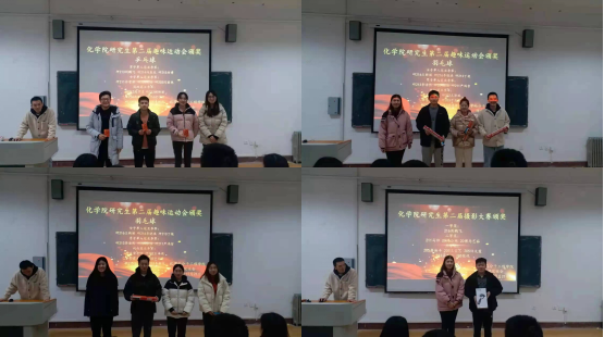 为全面落实全国研究生教育会议精神,推进新时代研究生教育高质量发展,12月21日,化学院在一政243开展“五育提升计划”暨第二届摄影大赛、趣味运动会颁奖典礼。化学院分团委书记兼2019级本科生辅导员刘施施、研究生辅导员程丽、2020级本科生辅导员陶亚亚、2020级本科生兼职辅导员王晶晶以及全体研究生学生骨干参加本次会议,王泽琨担任主持人。