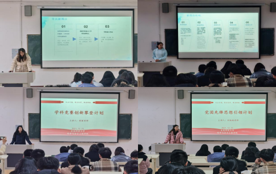 计划内容主要包括美育化人涵养提升计划、学科竞赛创新攀登计划、党团先锋思想引领计划。首先,陶亚亚从新闻写作方面强调新闻立意应不落窠臼并阐述合格新闻稿的基本要求,随后王晶晶结合以往新闻存在的问题具体介绍新闻写作方法和技巧;程丽从学科竞赛方面,着重强调团结协作的科创比赛精神内核,鼓励广大化研学子积极参与;刘施施从党团先锋思想方面,主要强调班团一体化是贯穿团学工作的核心思想,充分发挥党员的先锋模范作用,提高集体凝聚力。最后,刘施施、陶亚亚、程丽分别为第二届摄影大赛、趣味运动会获奖同学颁奖。