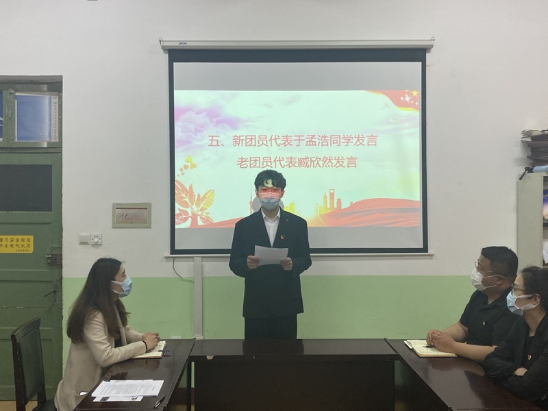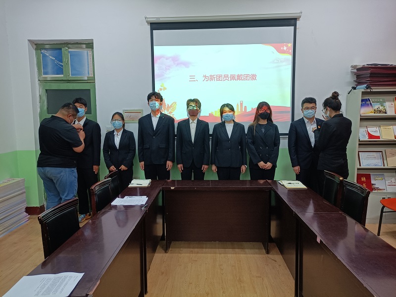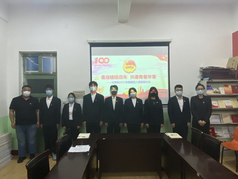 在中国共产主义青年团成立100周年之际,化学院组织结合疫情防控要求,于5月10日下午举办“喜迎建团百年,共谱青春华章”2022年新发展团员入团仪式,化学院团委老师刘施施、苗清、陶亚亚、信连涛及全体新发展团员、青年团员代表参加仪式。