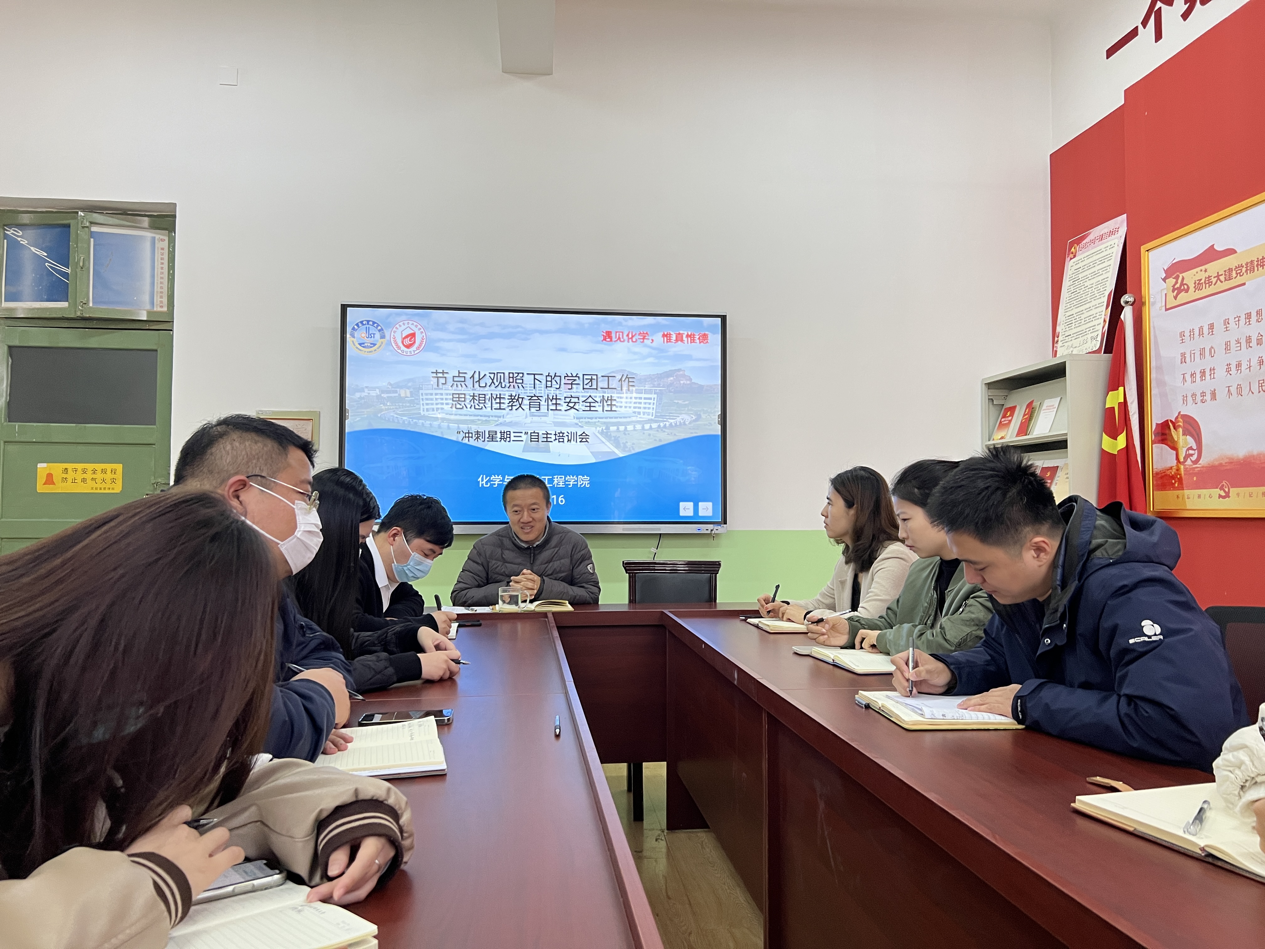 11月16日,化学院组织“节点化观照下的学团工作思想性教育性安全性”自主培训会,学院学工办全体辅导员参加,会议由学工办主任刘施施主持。