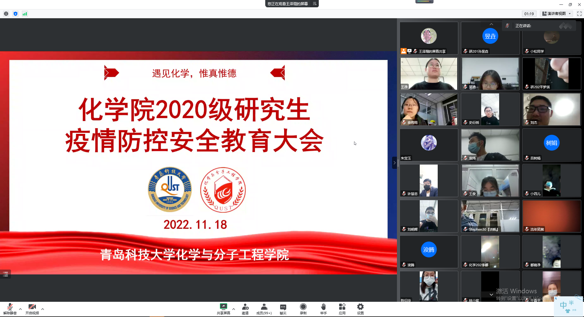 化学院借助惟真惟德大讲堂,以解读会的形式,引导全体研究生充分认识学校疫情防控工作,切实解答同学们关心的问题,加强研究生在科研、学习、就业方面的引导,同时增强全体研究生对学校、学院、班级各项工作的支持和认可,同心同德,共筑校园防疫安全环境。