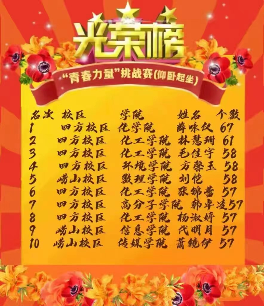 10月20日,yl23455永利集团体育联盟组织召开青春力量挑战赛,永利y23455薛咏仪同学以67个仰卧起坐的优异成绩拿下“青春力量”挑战赛(仰卧起坐)的第一名。
