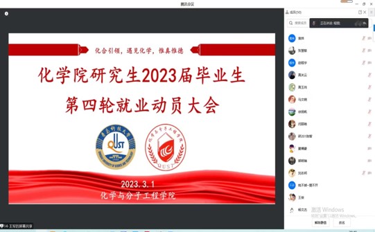 为引导2023届毕业生合理做好规划,树立正确的就业观念,提高就业积极性和主动性,抢抓就业机遇。3月1日,化学院召开研究生2023届毕业生第四轮就业动员大会,化学院研究生辅导员程丽出席会议,研究生2023届毕业生参加会议。会议由张家康主持。