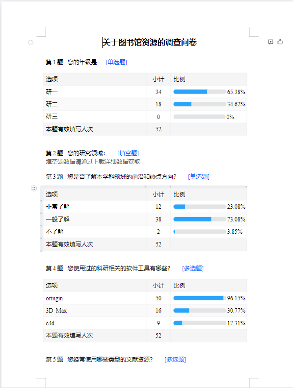 目前,调查活动已经圆满结束。初步统计和分析结果显示,大部分学生对图书馆资源有一定的了解,但在使用频率和深度上存在差异。学生们普遍认为,图书馆资源的丰富性对他们学习和研究有着重要帮助,但也提出了一些关于提高资源获取效率和提升服务质量等方面的建议。