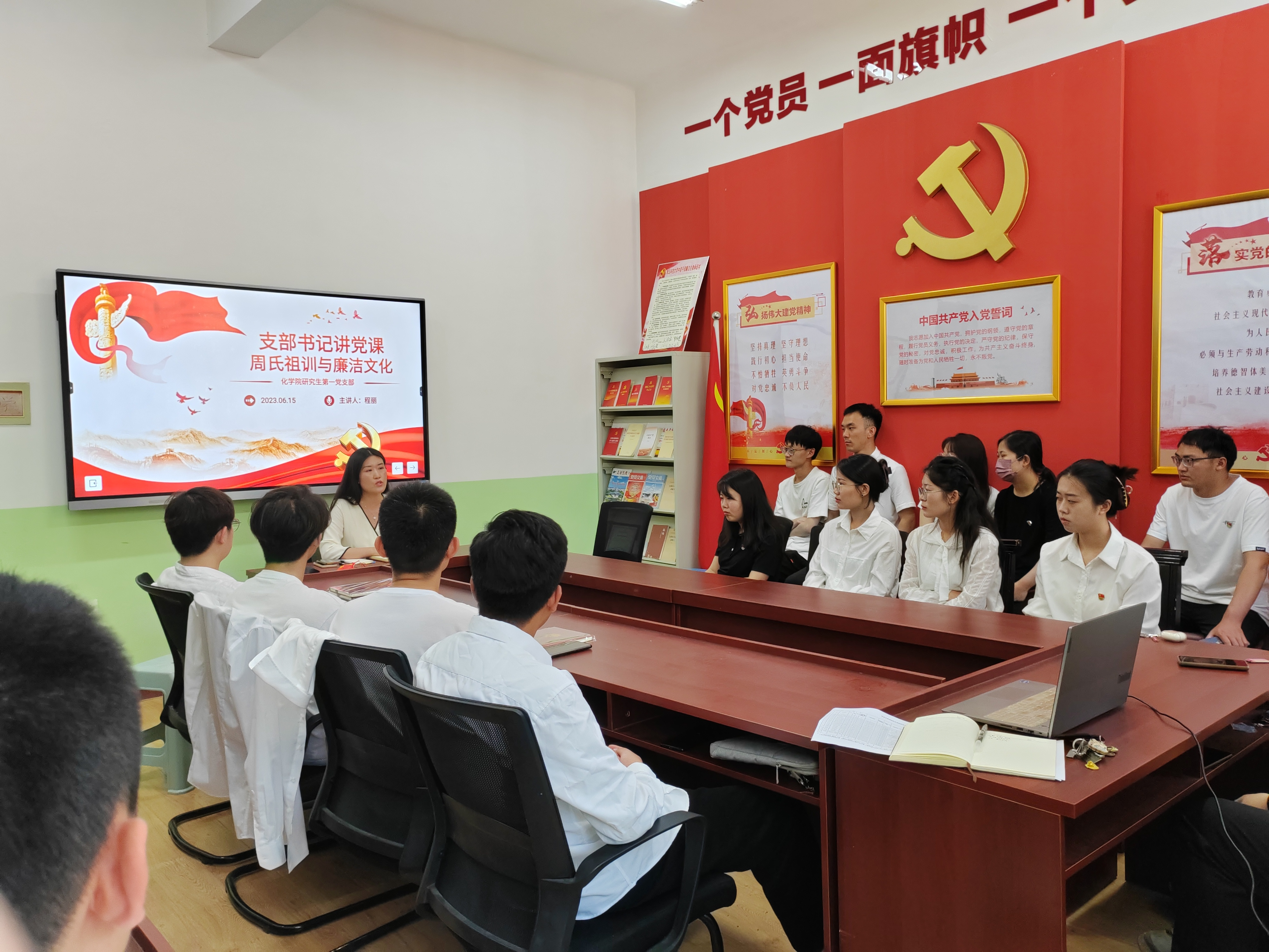 为响应学校毕业生主题教育工作安排,勉励广大毕业生党员坚定理想信念,增强党员廉洁自律意识,永葆共产党员的政治本色。化学院研究生第一党支部于2023年6月15日以支部书记讲党课的形式开展毕业生廉洁文化教育,本次会议由党支部书记程丽老师主持。