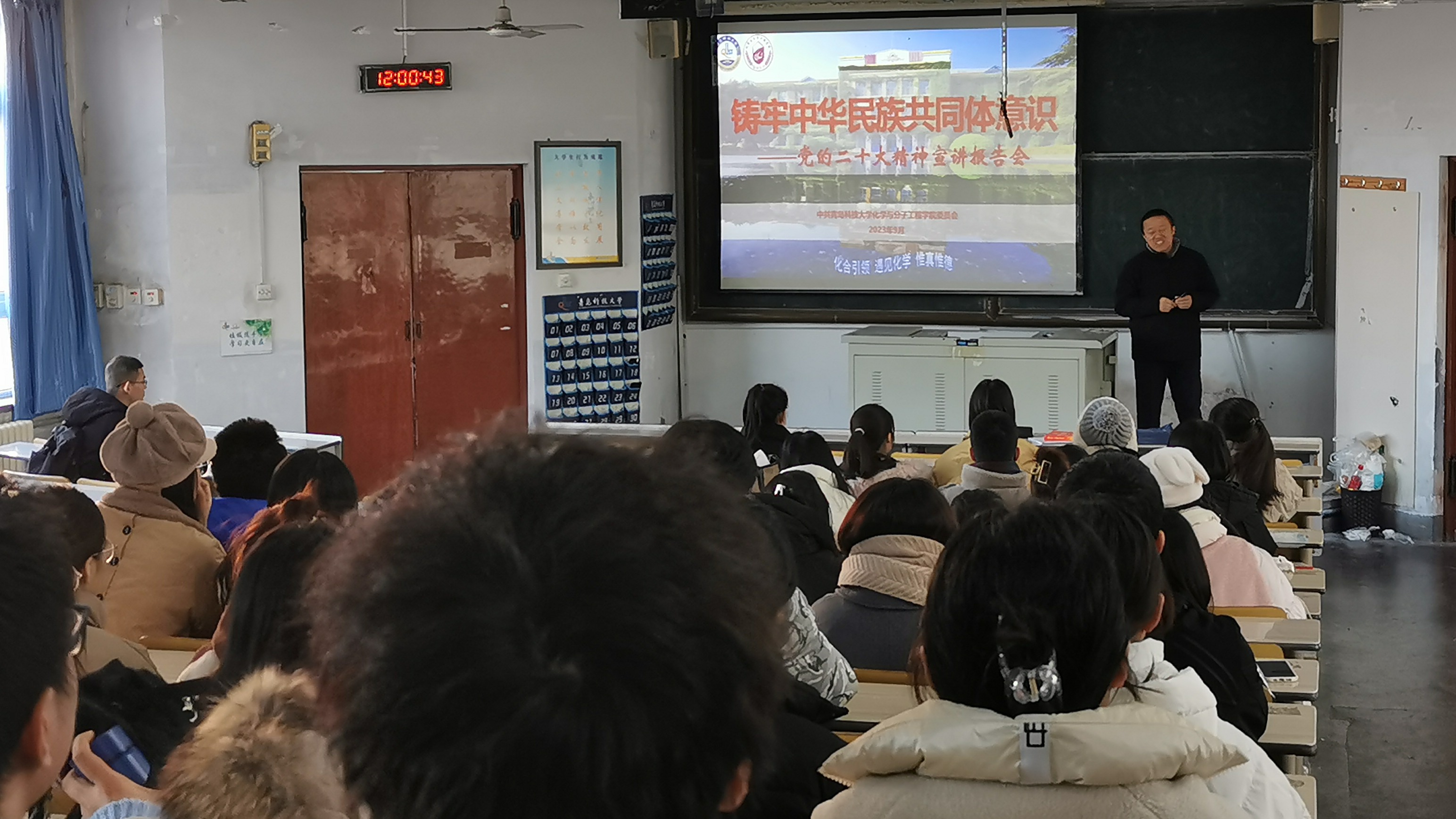 为认真学习习近平新时代中国特色社会主义思想,贯彻落实党的二十大和中央民族工作会议精神,10月31日,化学院党的二十大精神之铸牢中华民族共同体意识宣讲报告会在四方校区一教211举行。学院120余名中共党员、入党积极分子、学生骨干和部分少数民族学生参加报告会。学院党委副书记兼副院长杨小明主持报告会并作主旨宣讲。