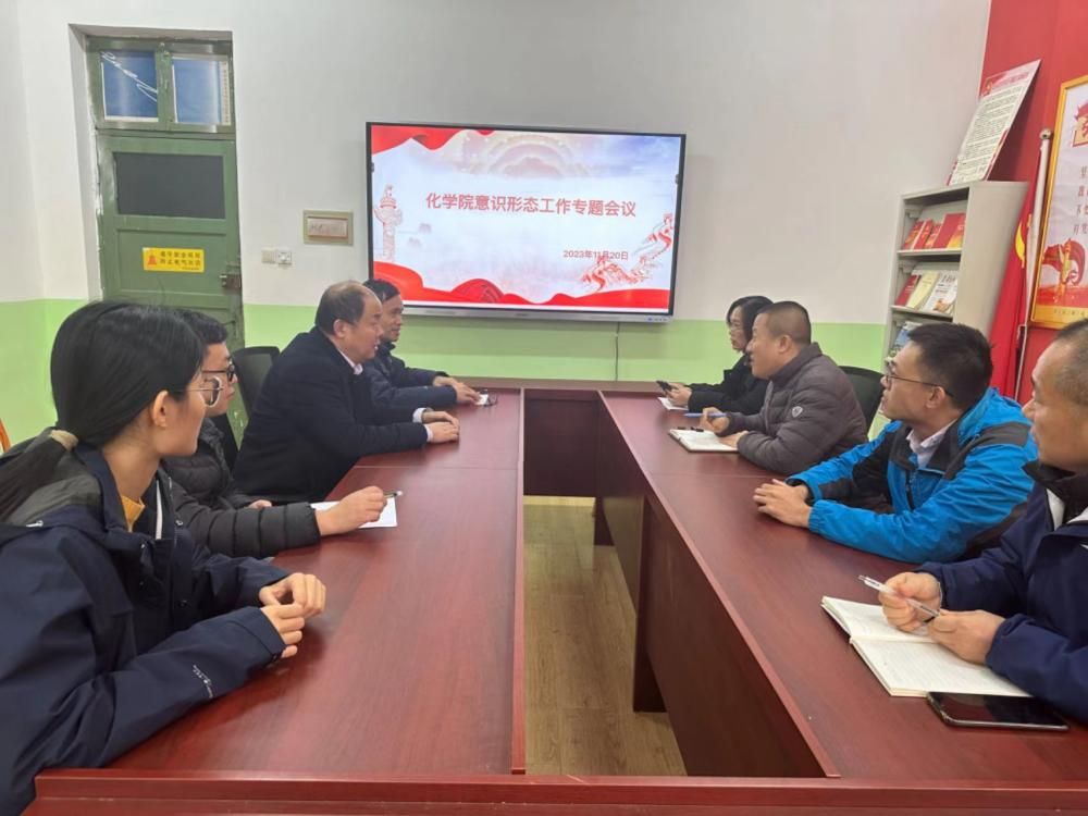 为扎实推进学习贯彻习近平新时代中国特色社会主义思想主题教育,进一步抓好意识形态工作,落实党管意识形态原则,巩固意识形态工作阵地,进一步做好新时代意识形态工作,11月20日下午,化学院意识形态工作专题会议在一政223会议室举行,学院党委全体委员参加会议,会议由学院党委书记王德宝主持。