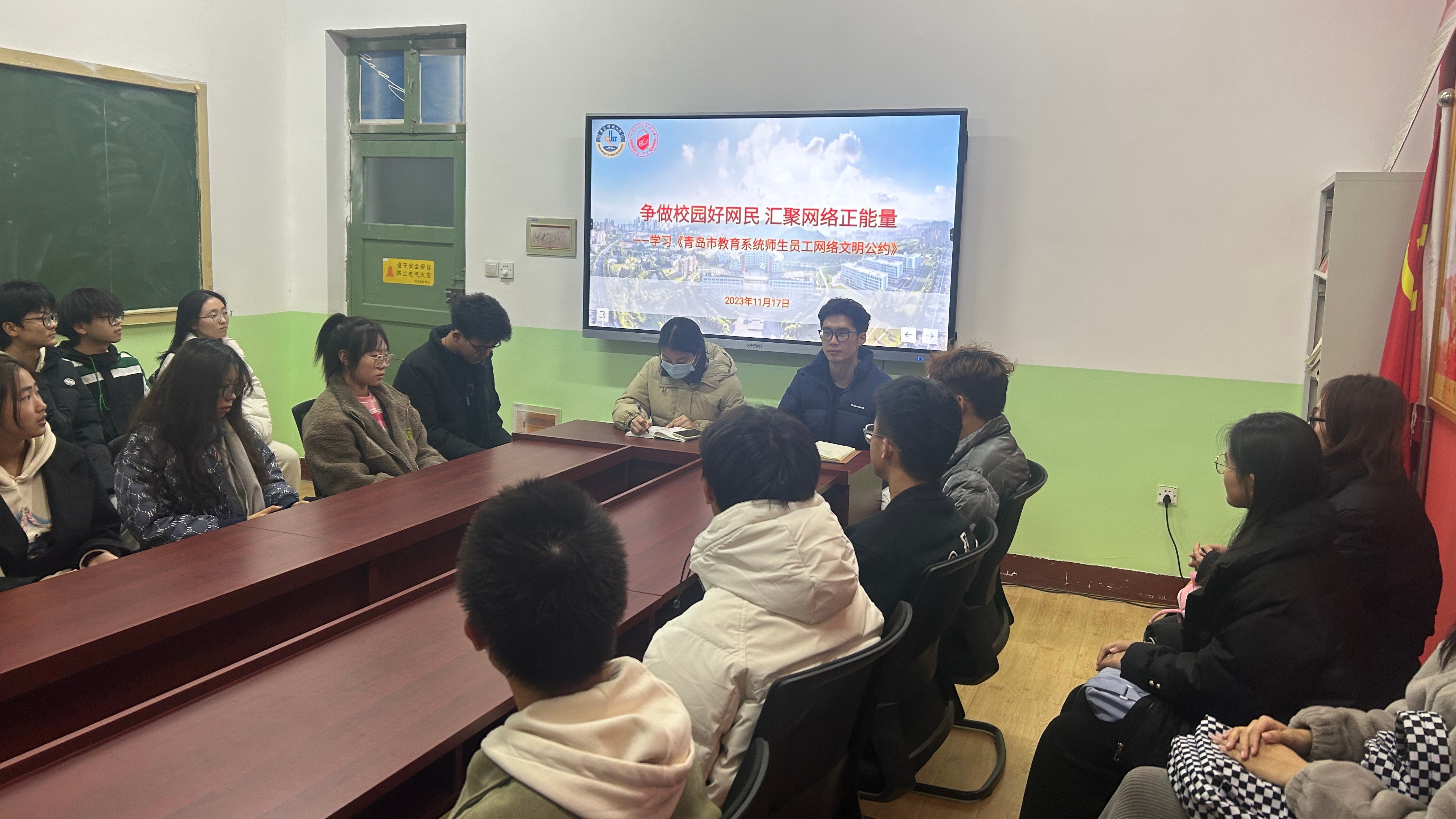 学习《青岛市教育系统师生员工网络文明公约》、开展反诈意识宣讲会,引导学生网络文明互动、理性发言表达,弘扬主旋律、传播正能量、发出“网络好声音”,不断提升学生识网、管网、用网能力,引导学生树立网络文明理念,提高学生网络媒介素养。