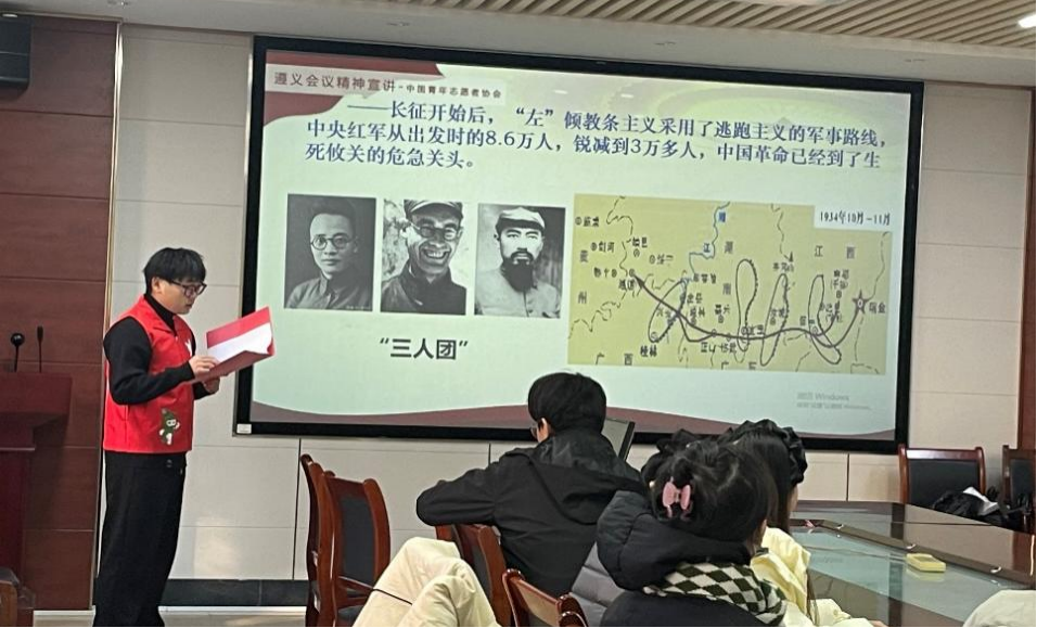 宣讲伊始,宣讲团队向化学与药学院同学们进行了简要的自我介绍。宣讲团成员翁建翔通过系统阐述遵义会议的历史背景、重要地位和深远影响,帮助青年同志全面了解这段光辉历程。他们强调,遵义会议精神是我们党的宝贵精神财富,是激励我们奋发向前的不竭动力。宣讲过程中,志愿宣讲团运用大量翔实的资料、生动的案例和感人至深的故事,对遵义会议精神进行了全面解读。同时,他们还与青年同志进行互动交流,引导大家结合自身实际谈体会、话感悟。